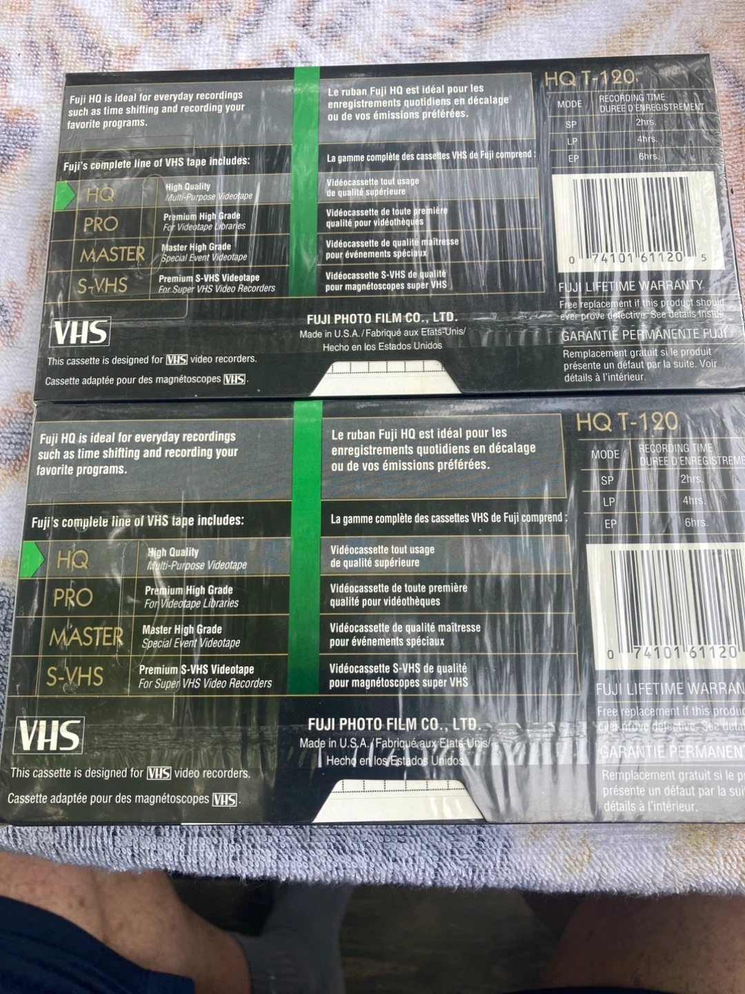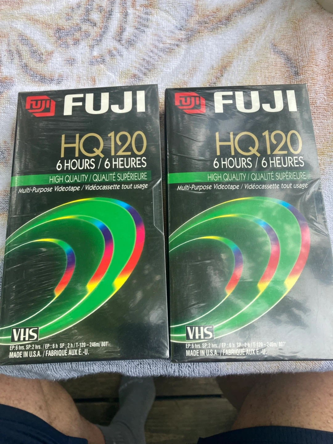 Selling two new sealed FUJI HQ 120 VHS tapes. Each tape provides 6 hours of recording time. They are multi-purpose videotapes, perfect for everyday recordings and time-shifting your favourite programs.