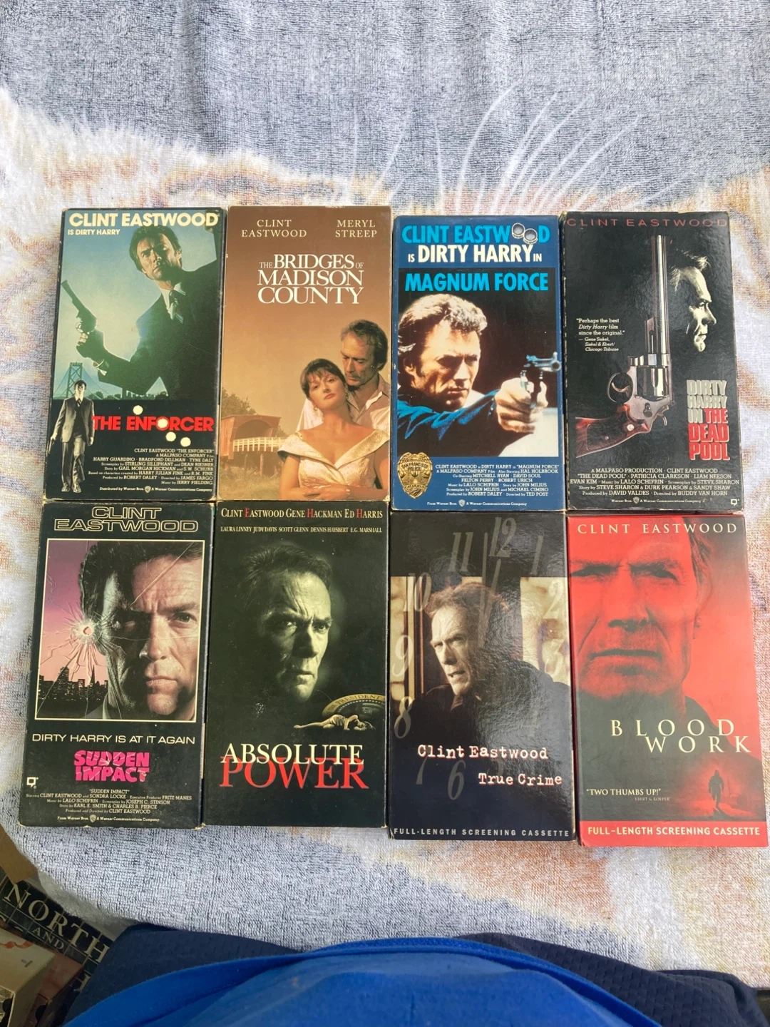 Selling a collection of Clint Eastwood VHS tapes! Titles include : The Enforcer The Bridges of Madison County Magnum Force Dirty Harry in the Dead Pool, Sudden Impact Absolute Power True Crime Blood Work Perfect for any Clint Eastwood fan!