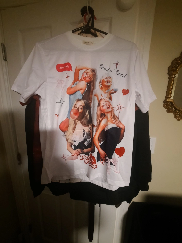 Cute white tee with a fun graphic! Perfect for a casual day out or a comfy night in. The design features some lovely ladies and the phrase 'Short n' Sweet'. It's in great condition and ready for a new home