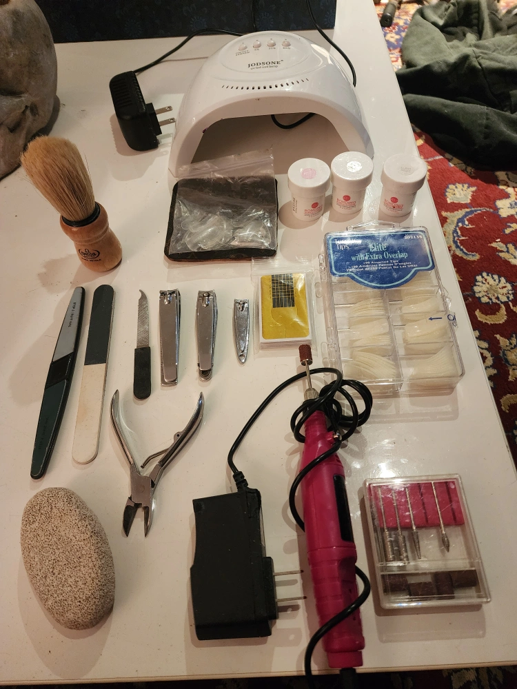Selling a nail art kit! Includes: - ASP Bonding Acrylic Powder (Pink, White, Clear) - Terrific Tips Elite with Extra Overlap (100 assorted tips) - Nail clippers, files, and other tools - JODSONE UV nail lamp - Electric nail drill with bits Everything you need to create beautiful nails at home!