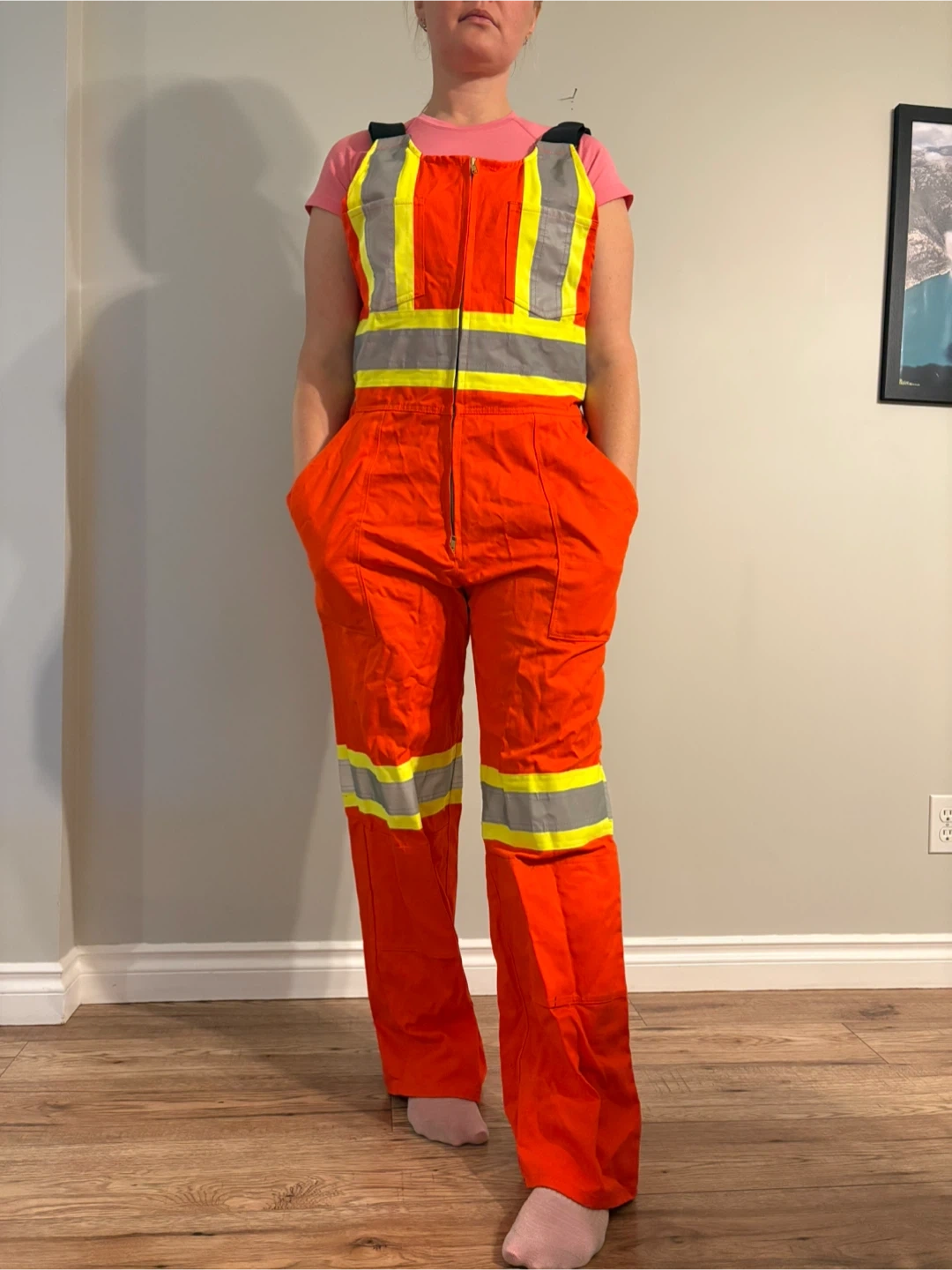 Selling a pair of Stalworth safety overalls in size 40M. These are bright orange and compliant with CAN/CSA Z96 standards. They're designed as Class 2 Level 2 overalls, perfect for visibility and safety on the job