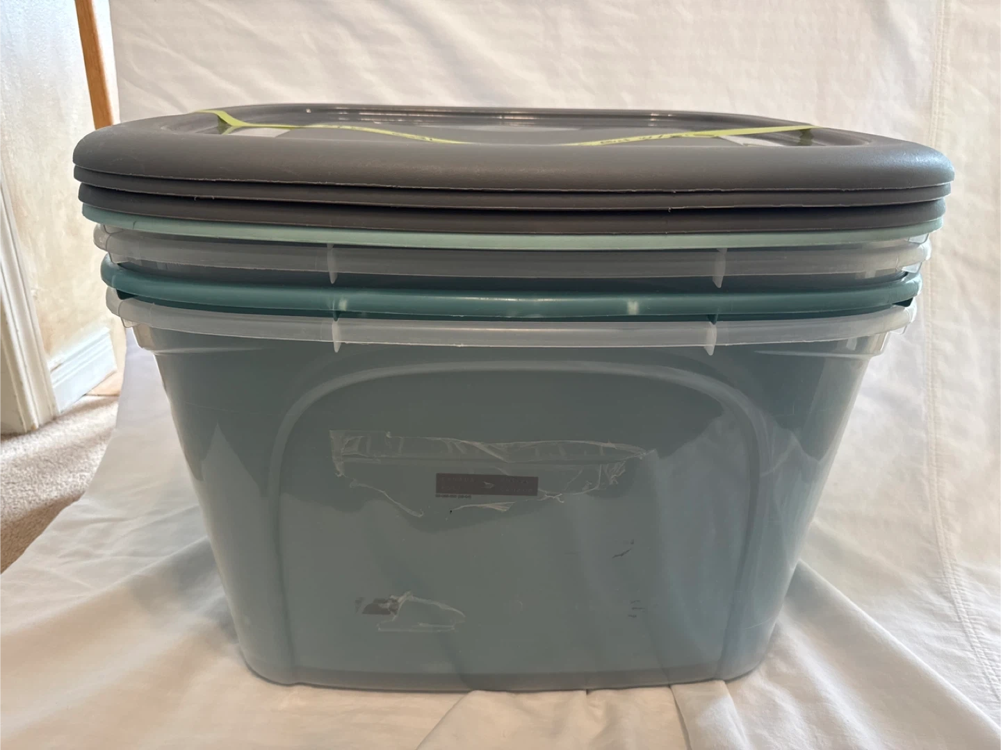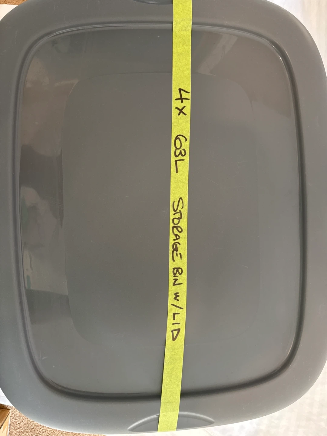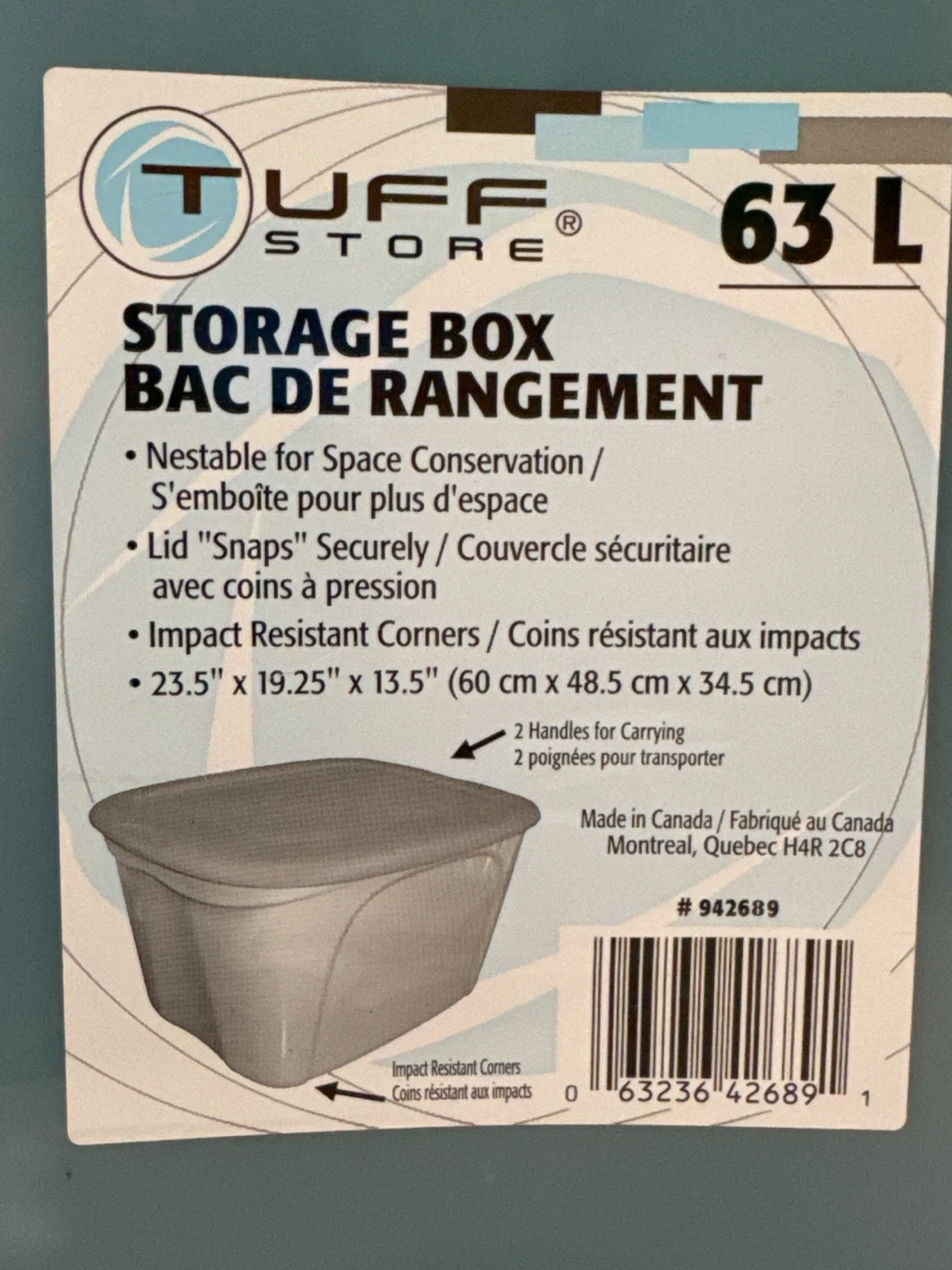 Selling a set of four Tuff Store 63L storage bins with lids! These are great for keeping your space organized. SFPF home. - Nestable for space conservation - Lids snap securely - Impact resistant corners - Dimensions: 23.5" x 19.25" x 13.5" (60 cm x 48.5 cm x 34.5 cm)