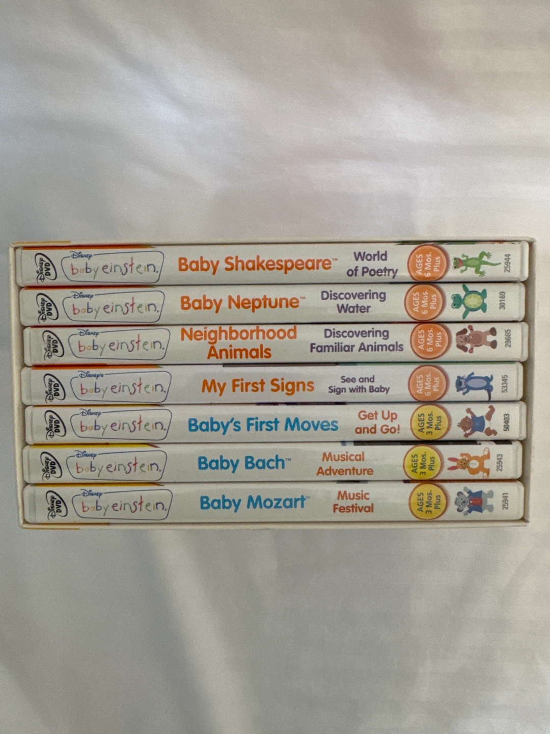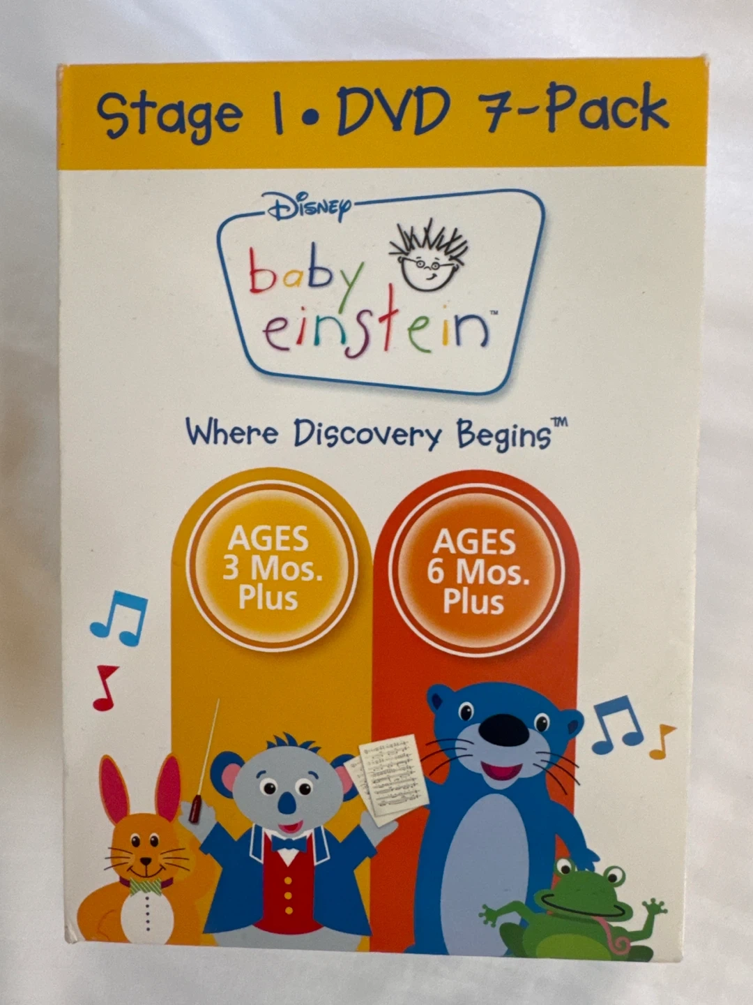 Selling a Baby Einstein Stage 1 DVD 7-Pack! This set is perfect for little ones aged 3 months and up. It includes titles like Baby Mozart, Baby Bach, Baby's First Moves, and more. Each DVD is designed to inspire discovery at every stage