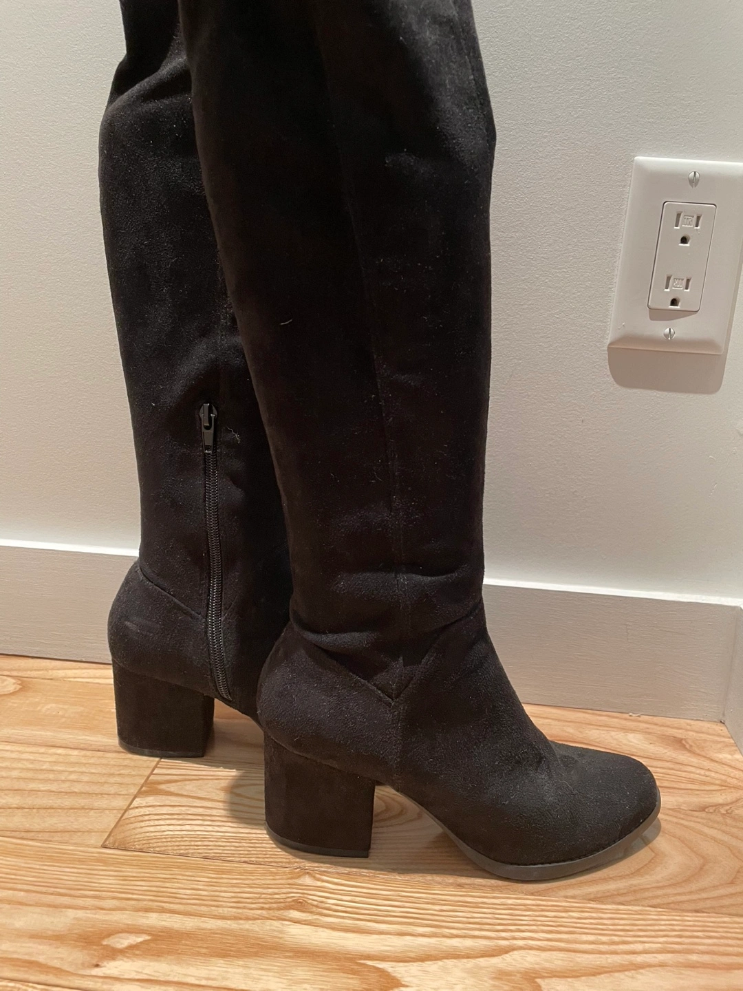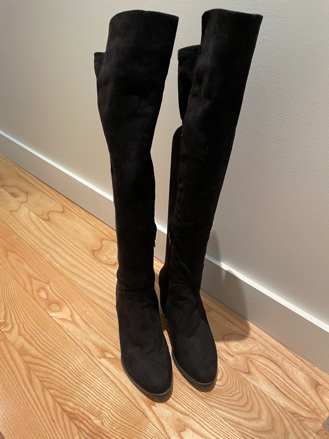 Selling a pair of black over-the-knee boots. They're made of a soft suede material and feature a comfortable block heel. Great for adding a touch of style to any outfit!
