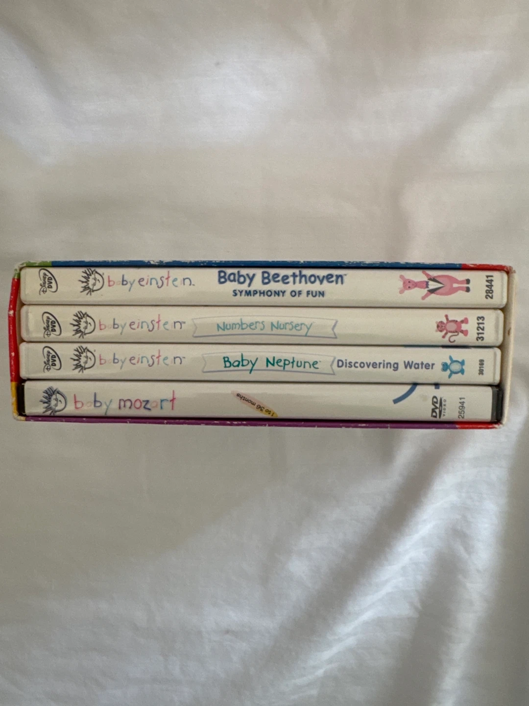 Selling a collection of Baby Einstein DVDs! Includes: - Baby Beethoven Symphony of Fun - Numbers Nursery - Baby Neptune Discovering Water - Baby Mozart