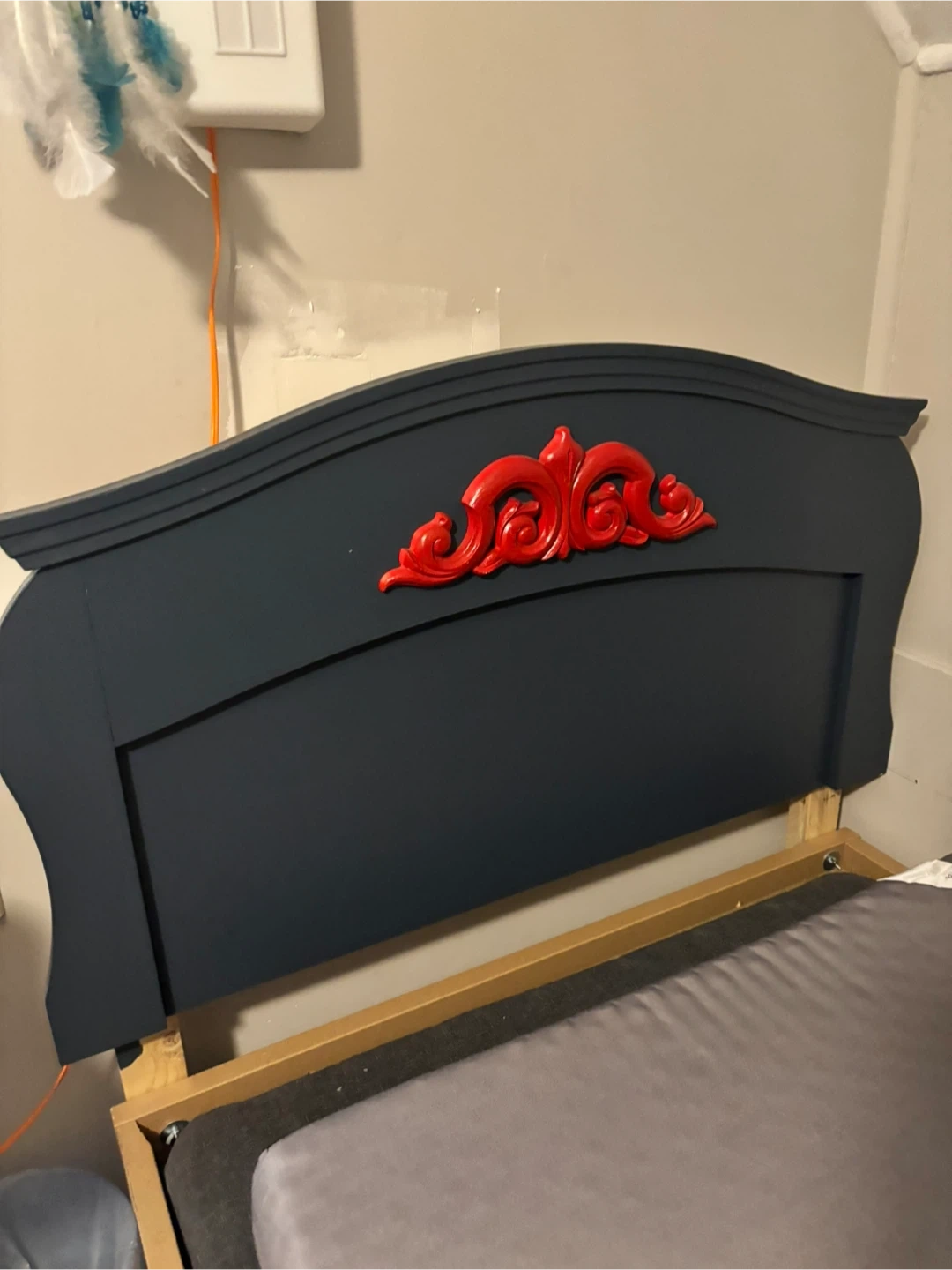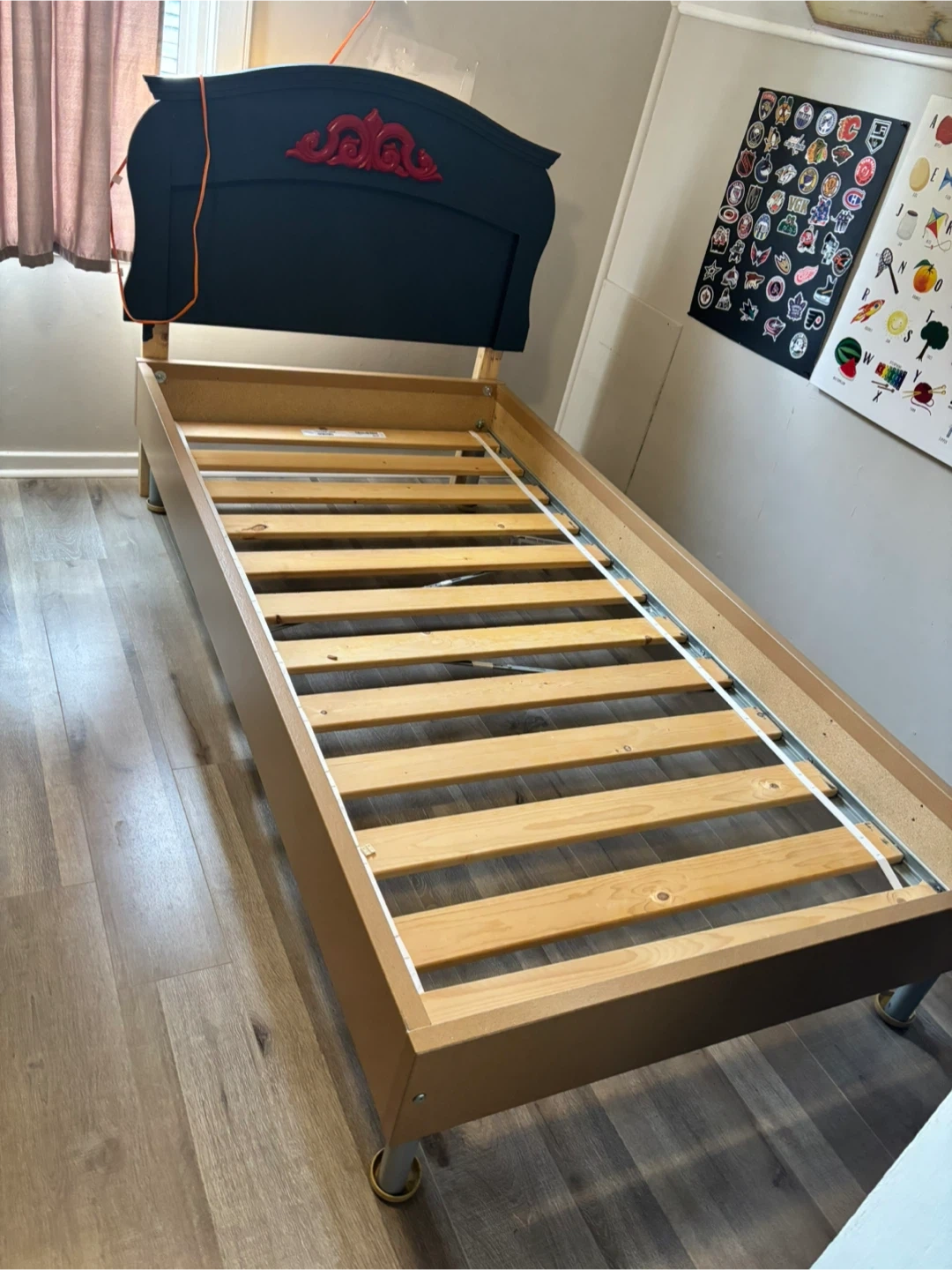Twin bed frame with a unique headboard. The frame is light brown and the headboard is dark blue with red detailing. It's in good condition and ready for a new home! With our without mattresses.