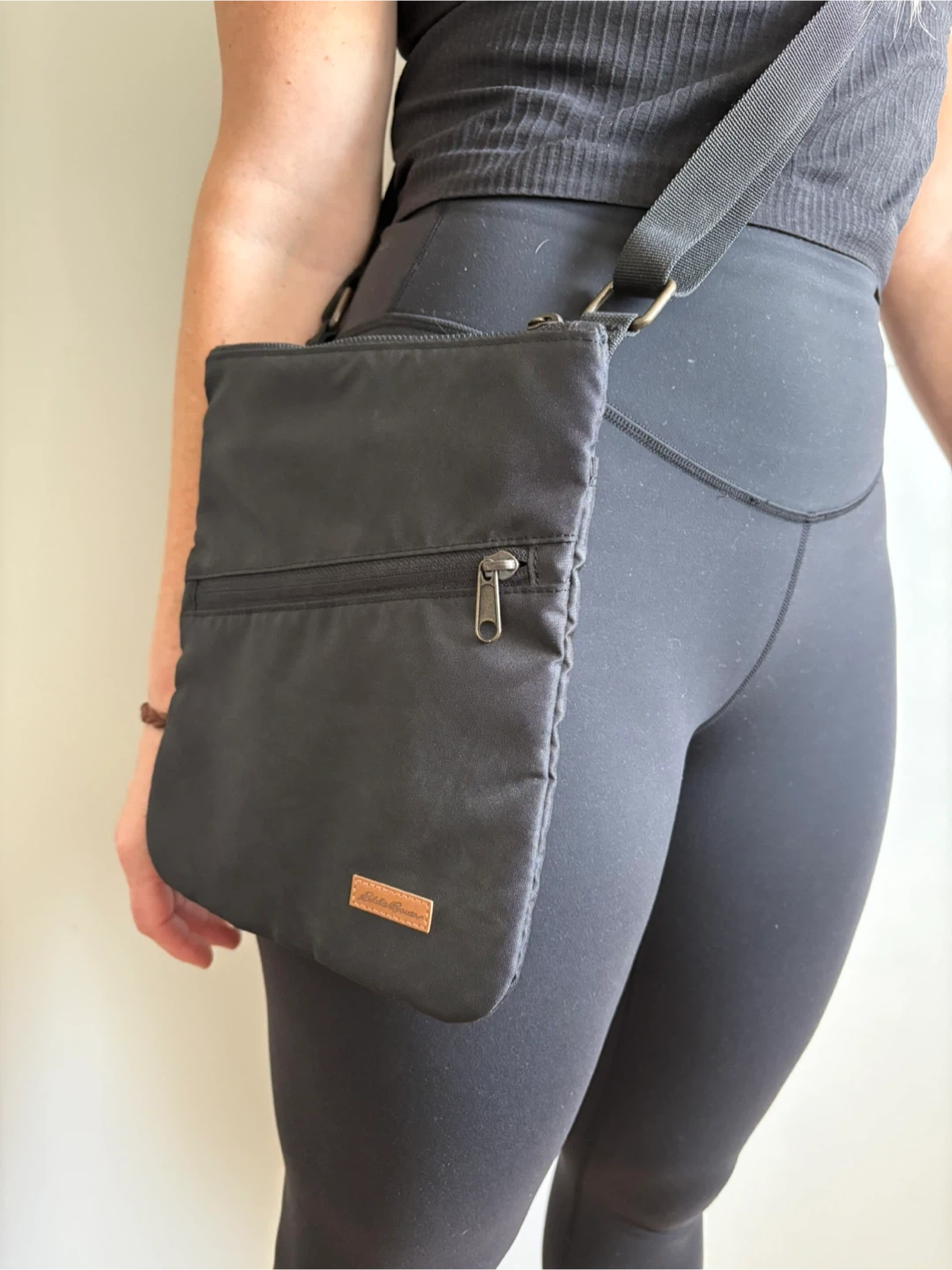 This Eddie Bauer crossbody bag is perfect for keeping your essentials close! It's a sleek black colour and features a handy front zipper pocket. Great for travel or everyday use!