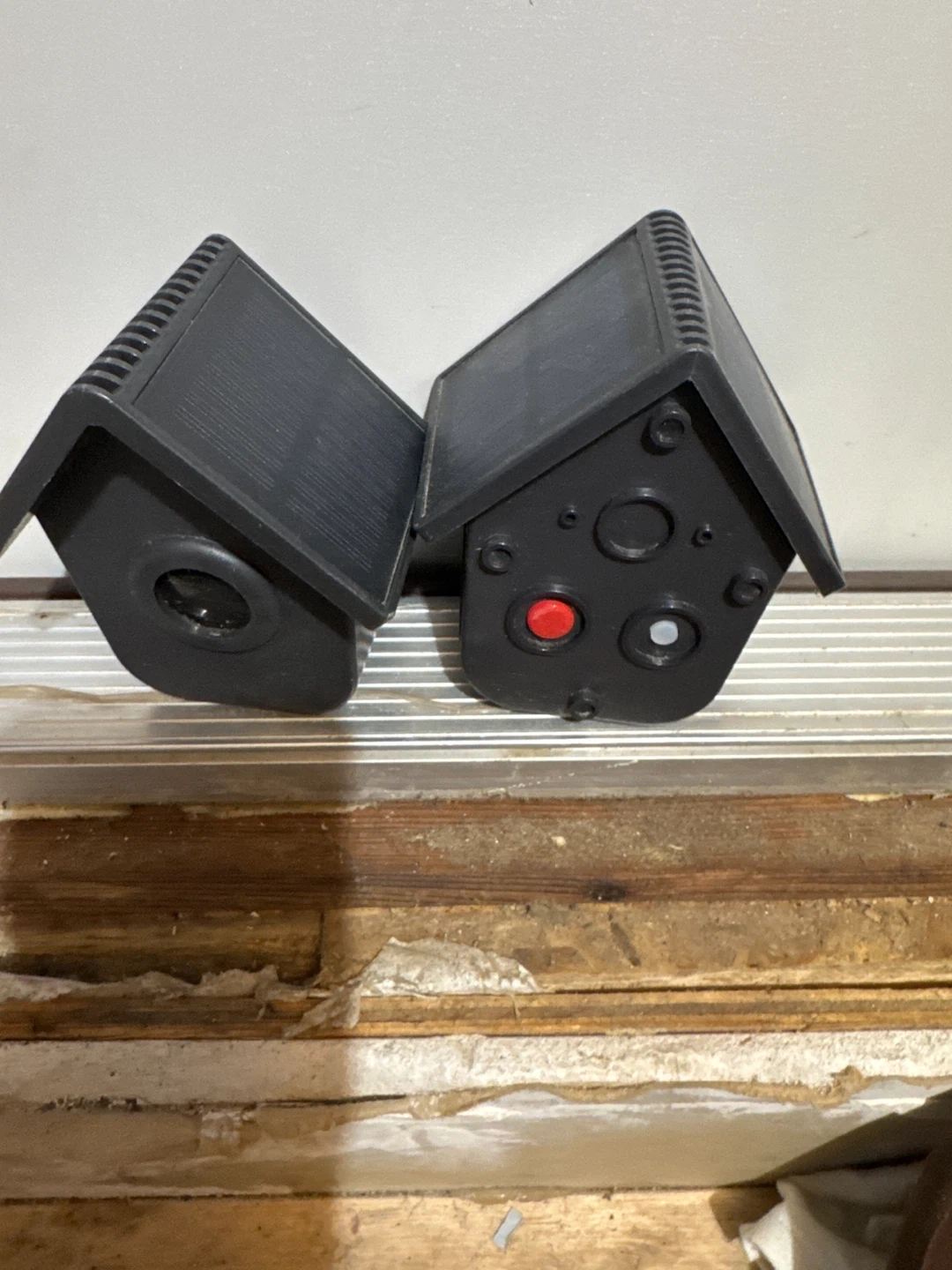 These outdoor solar powered motion sensor lights are perfect for adding extra security to your home. They're black and appear to be in good condition. Great for lighting up pathways or yards!