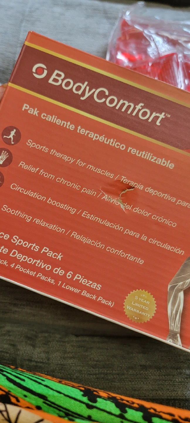 Selling a BodyComfort 6 Piece Sports Pack. This reusable therapeutic heat pack is designed for sports therapy, providing relief from chronic pain, boosting circulation, and promoting soothing relaxation. Includes 1 sport pack, 4 pocket packs, and 1 lower back pack