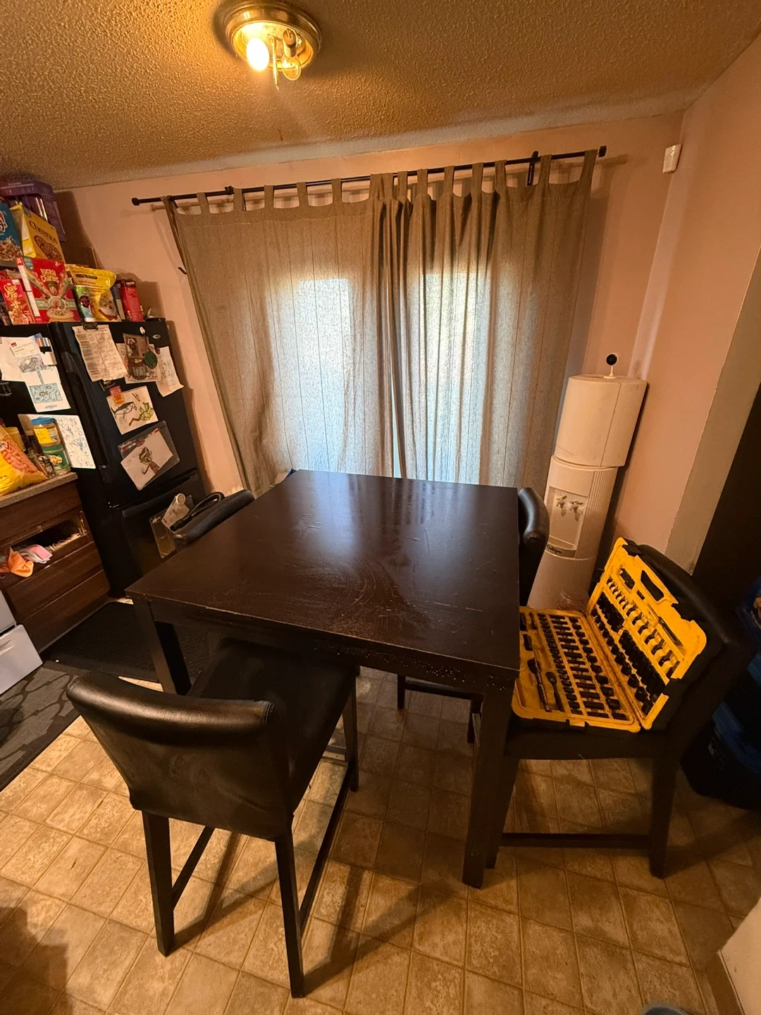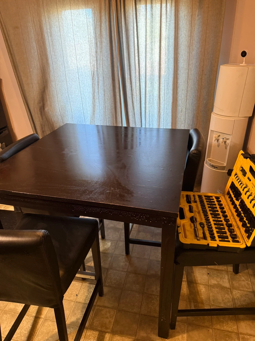 Selling a dark black square bar height table that comes with four matching chairs. It's a great set for a smaller dining space or kitchen nook. The table and chairs are sturdy and in good condition, ready to be a part of your home!