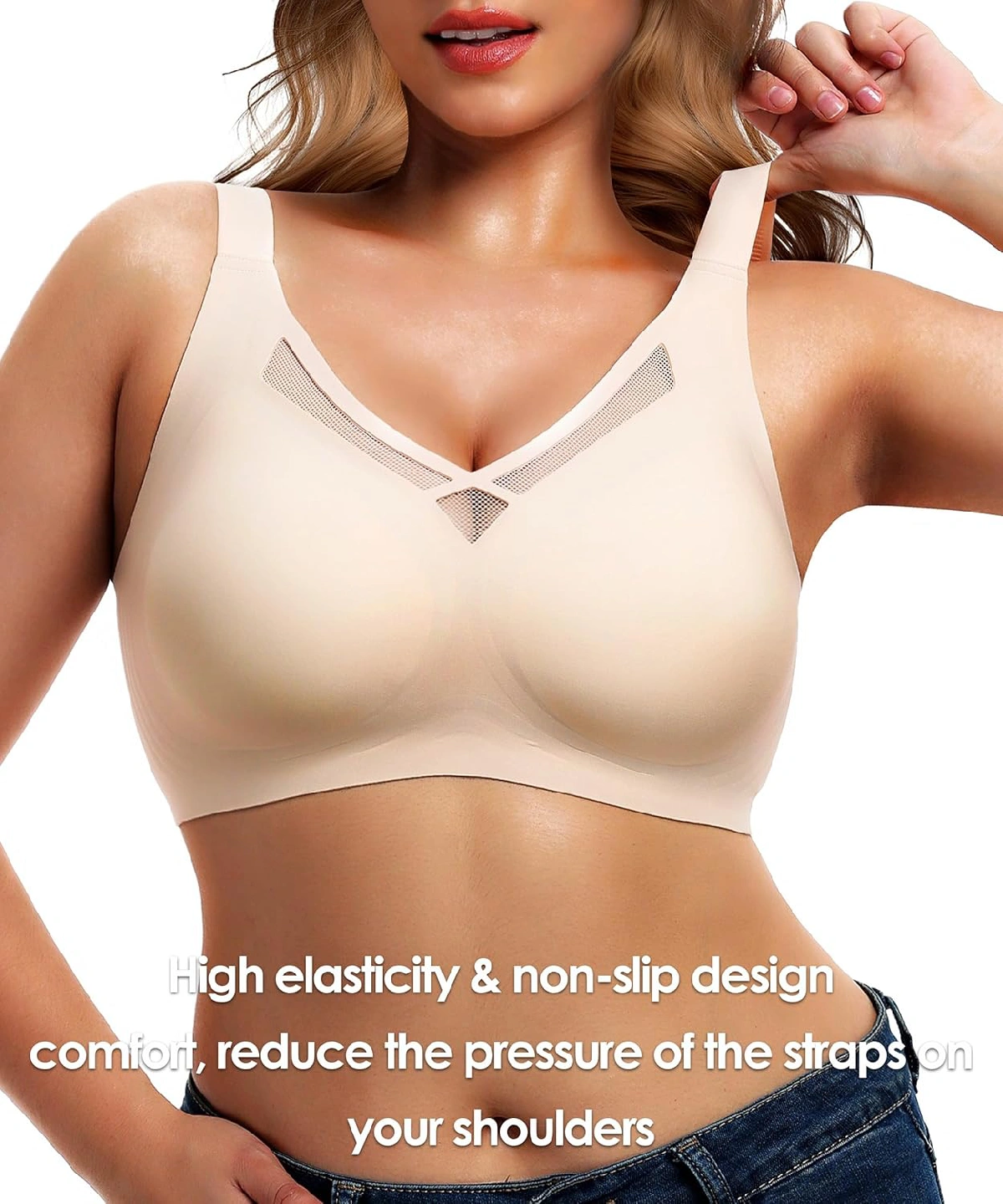 Selling a Jelly Strips bra in size 38DD. It's made of 58% Polyamide and 42% Spandex. Features include a seamless hook & eye design and an all-around smooth U-shaped back and coverage. Also has high elasticity and a non-slip design for comfort and to reduce pressure on the straps