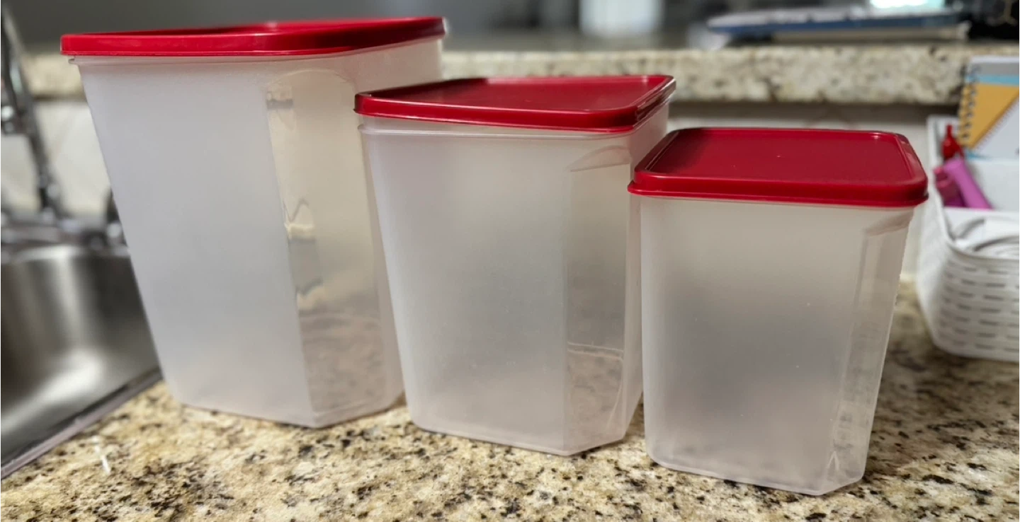Selling a set of three Rubbermaid Modular Canisters! These are great for keeping your pantry organized. The set includes three different sizes, all with red lids. They're in good condition and ready to help you declutter your kitchen