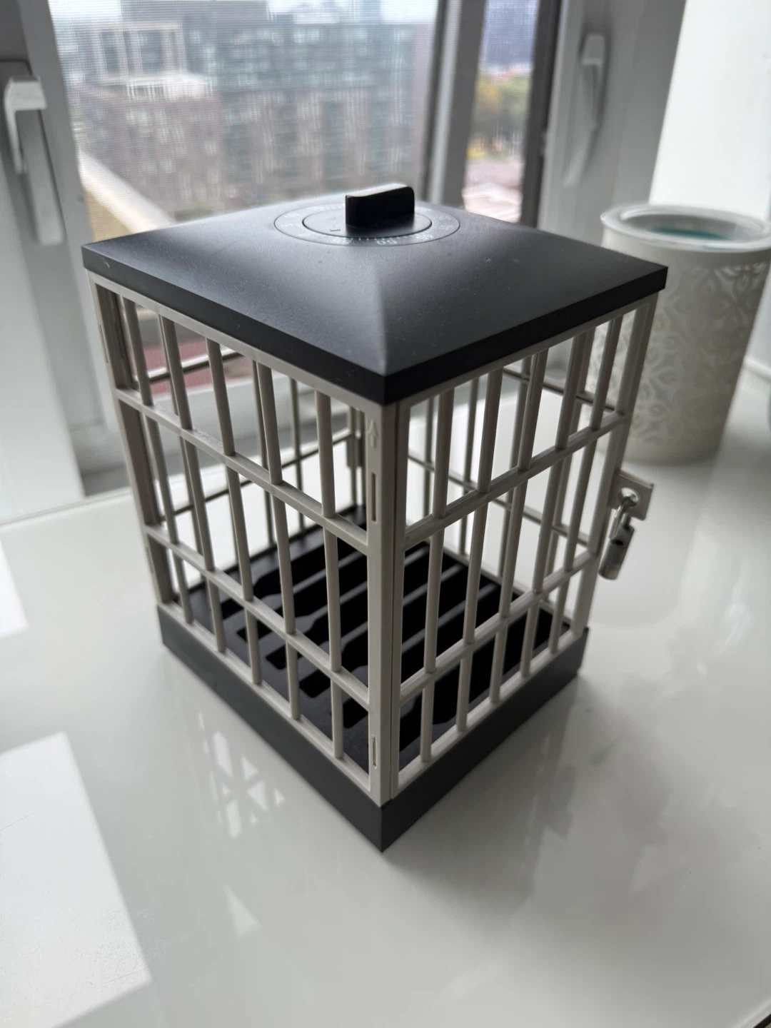 Novelty: The perfects gift choice for that phone addict in your life. Your friends, kids or partners will be sure to laugh at this novelty gift item. Also can be used to keep other small things locked up where you lack self control. Enjoy Your Family Time: If you want to replace screen tapping with talking during family time, your home needs a cell phone jail. Don't let electronic screen interrupt your communicating fun. Capacity: Use as a fun way of controlling your kids' access to their mobile phone. With room for up to 6 phones, the jail cell lock up can be used as a fun way of limiting access to your kids' phone. Want to lock up their phone until chores or homework are done. No problem. Phone Cage with Lock Key: If you lack self control with your phone, let the phone jail cell help you out. Or are you trying to get something important done, but keep getting distracted. Just lock your phone up and hand your key to a friend, telling them not to let you have the key until the task is finished. Cell Phone Jail Lock Box: Specially designed to ensure that phones cannot be taken out while locked, and with a secure locking mechanism, nobody will be getting into the jail cell lock up without keys.