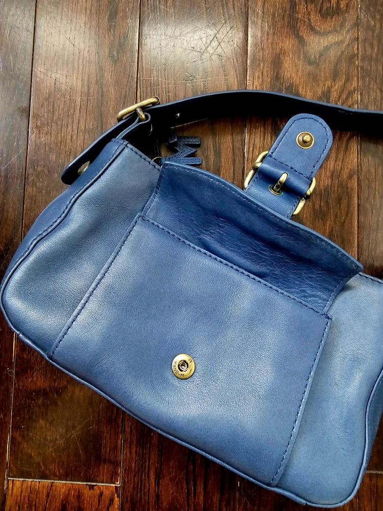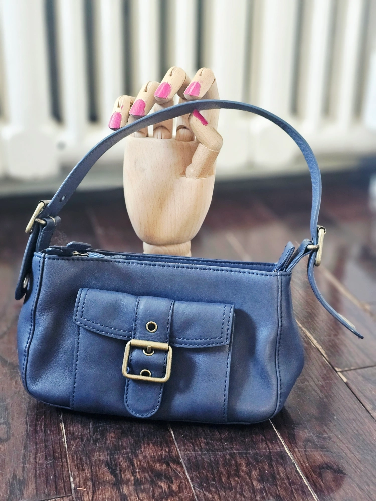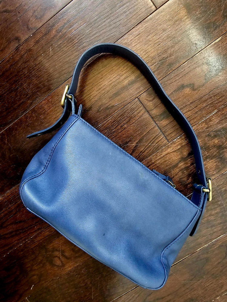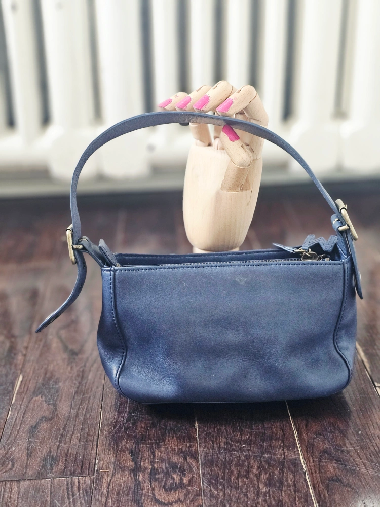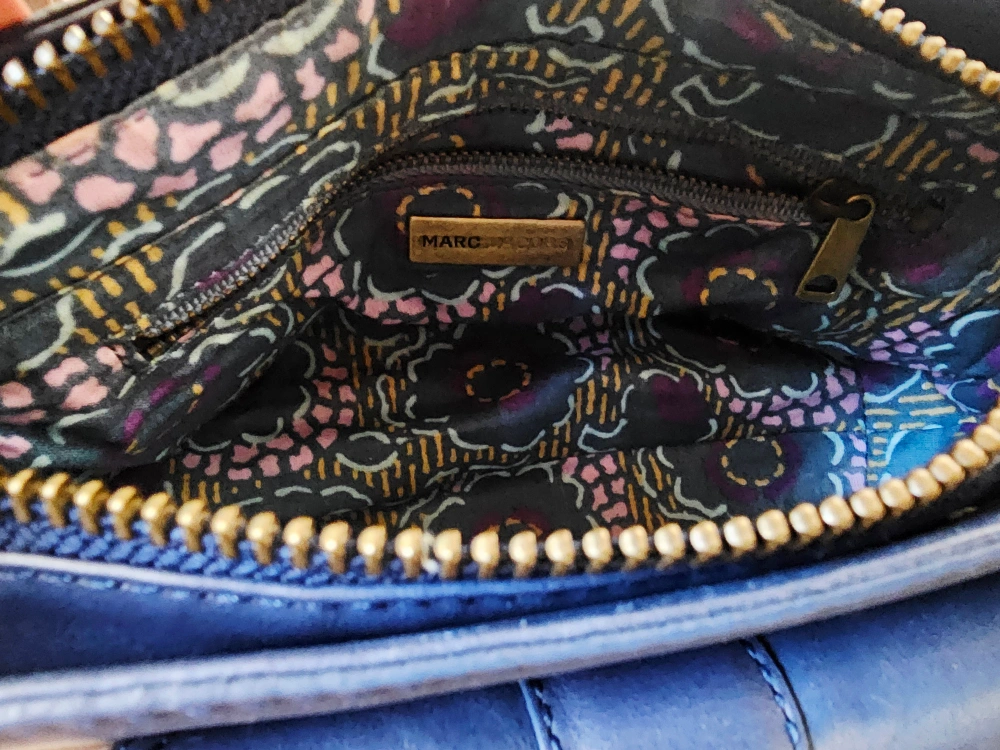 Adorable vintage Y2K mini baguette bag from designer Marc Jacobs, in dark blue leather with a floral patterned lining. Bag has brass hardware, with large buckles on the front and at the strap. One small front flap pocket with snap closure, one zippered main compartment, and one inner zippered pocket. Main zipper has leather "M" and "J" charms. Strap is adjustable. Bag is in good used condition with signs of wear. There are some small marks on the back and one larger mark on the bottom left side - please see photos for detail. Lining is clean and the leather is in good condition otherwise. Bag measures about 8.5" long x 5" tall x 3" wide. Strap currently measures about 15" long and can be adjusted to be a couple inches longer or shorter using the buckles on each side.