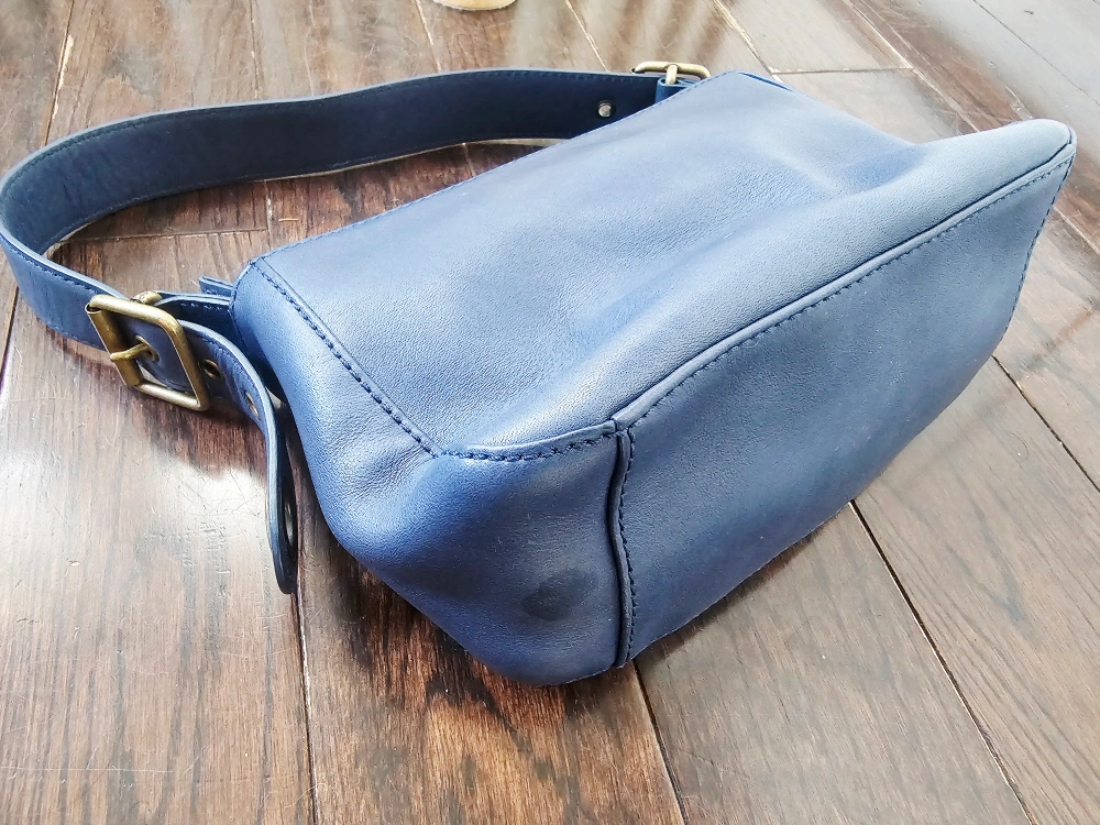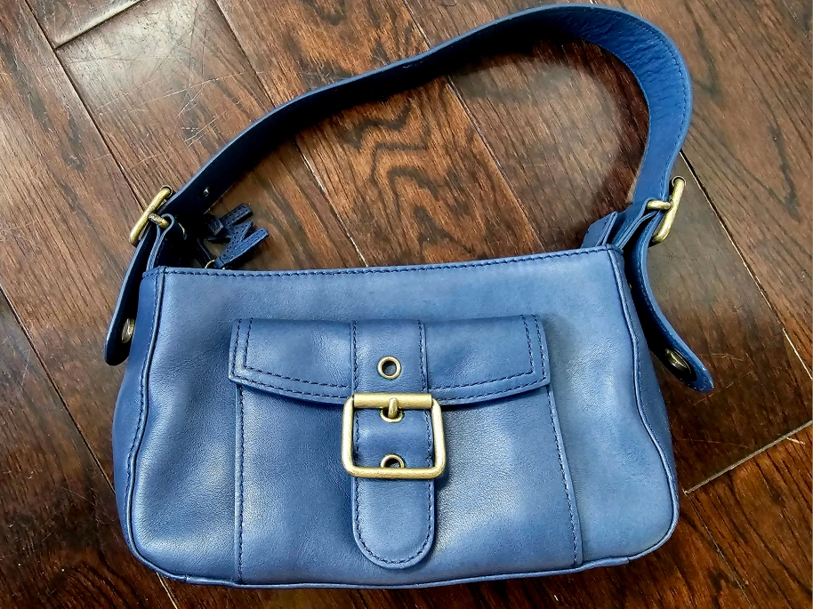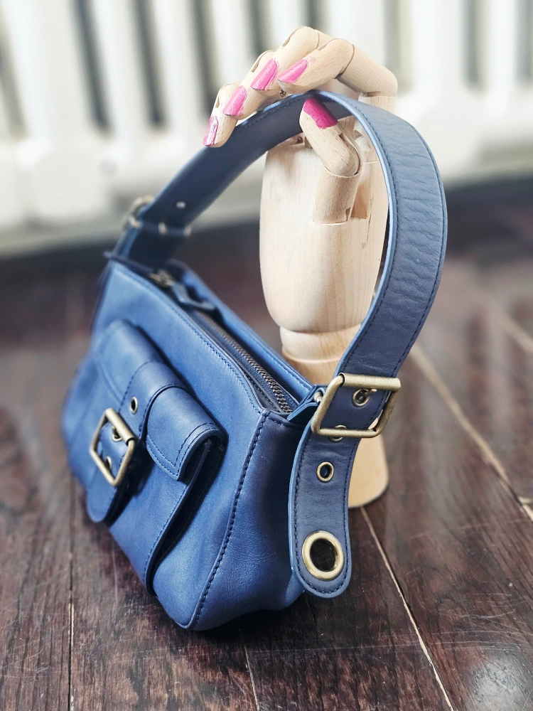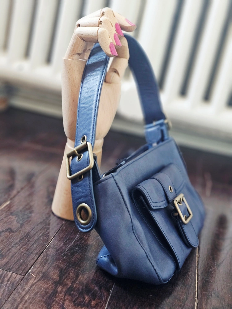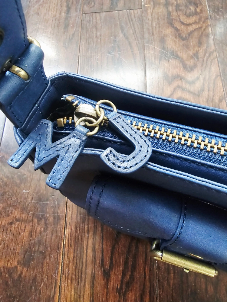 Adorable vintage Y2K mini baguette bag from designer Marc Jacobs, in dark blue leather with a floral patterned lining. Bag has brass hardware, with large buckles on the front and at the strap. One small front flap pocket with snap closure, one zippered main compartment, and one inner zippered pocket. Main zipper has leather "M" and "J" charms. Strap is adjustable. Bag is in good used condition with signs of wear. There are some small marks on the back and one larger mark on the bottom left side - please see photos for detail. Lining is clean and the leather is in good condition otherwise. Bag measures about 8.5" long x 5" tall x 3" wide. Strap currently measures about 15" long and can be adjusted to be a couple inches longer or shorter using the buckles on each side.