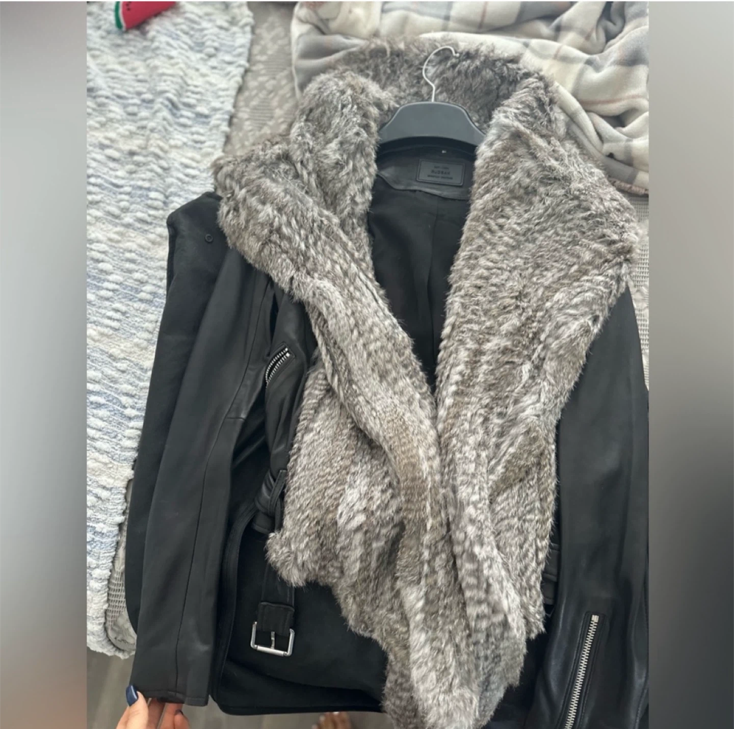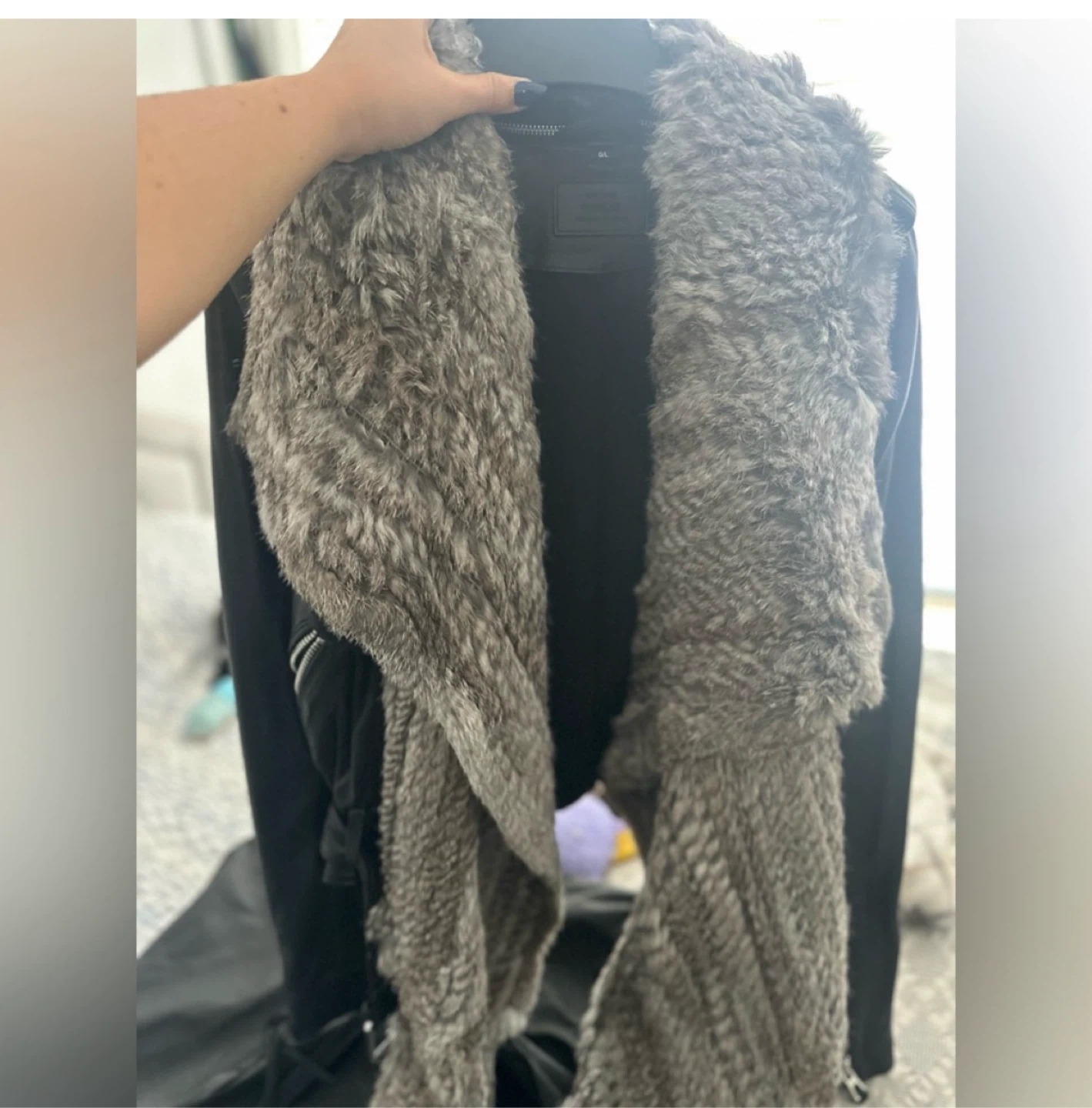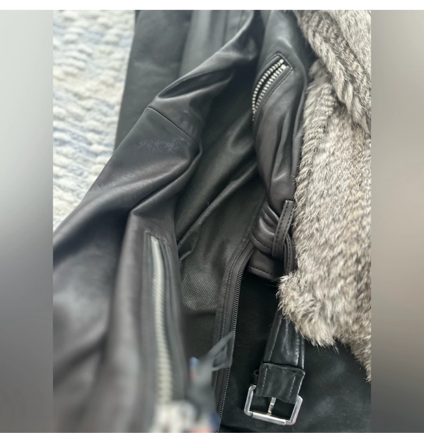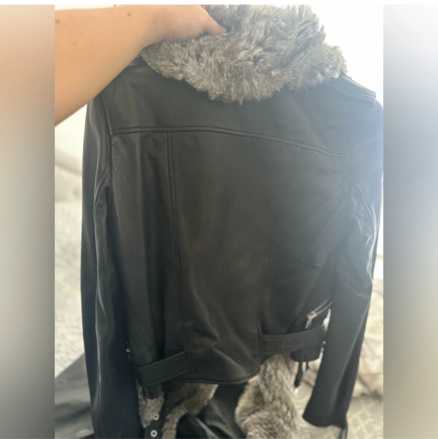 Selling a stylish black leather jacket with a recycled fur collar! It's in great condition and perfect for adding a bit of edge to your wardrobe. The jacket features a classic design with zipper and buckle details. It's a great layering piece for fall or winter!