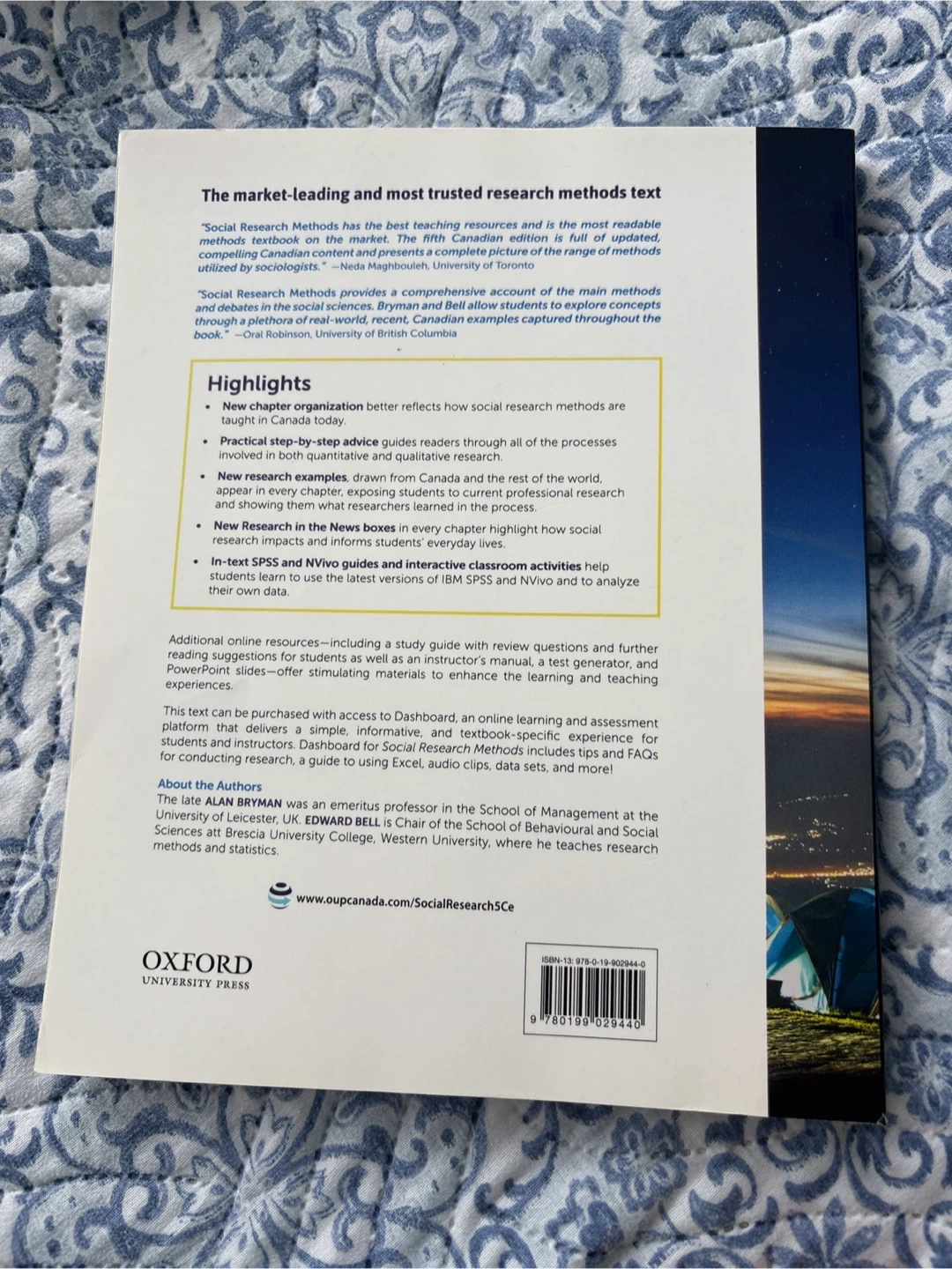 Selling "Social Research Methods" Fifth Canadian Edition by Alan Bryman & Edward Bell. This textbook is a great resource for learning about research methods in the social sciences. It includes step-by-step guidance and real-world examples to help you understand the research process