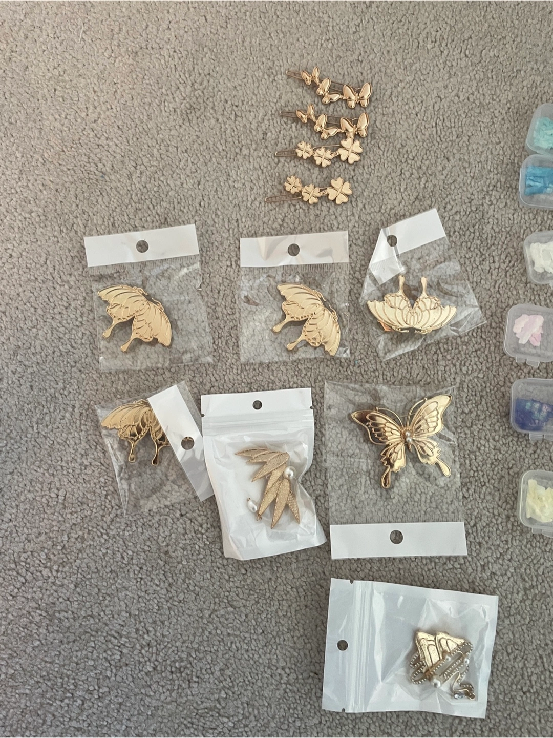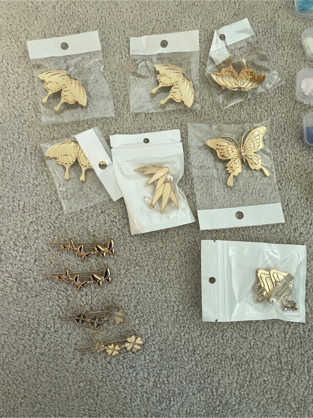 Brand new gold-toned butterfly hair accessories! These are perfect for adding a touch of elegance to any hairstyle. They come in various designs, including clips and pins, and are all individually packaged. Great for crafting or personal use!