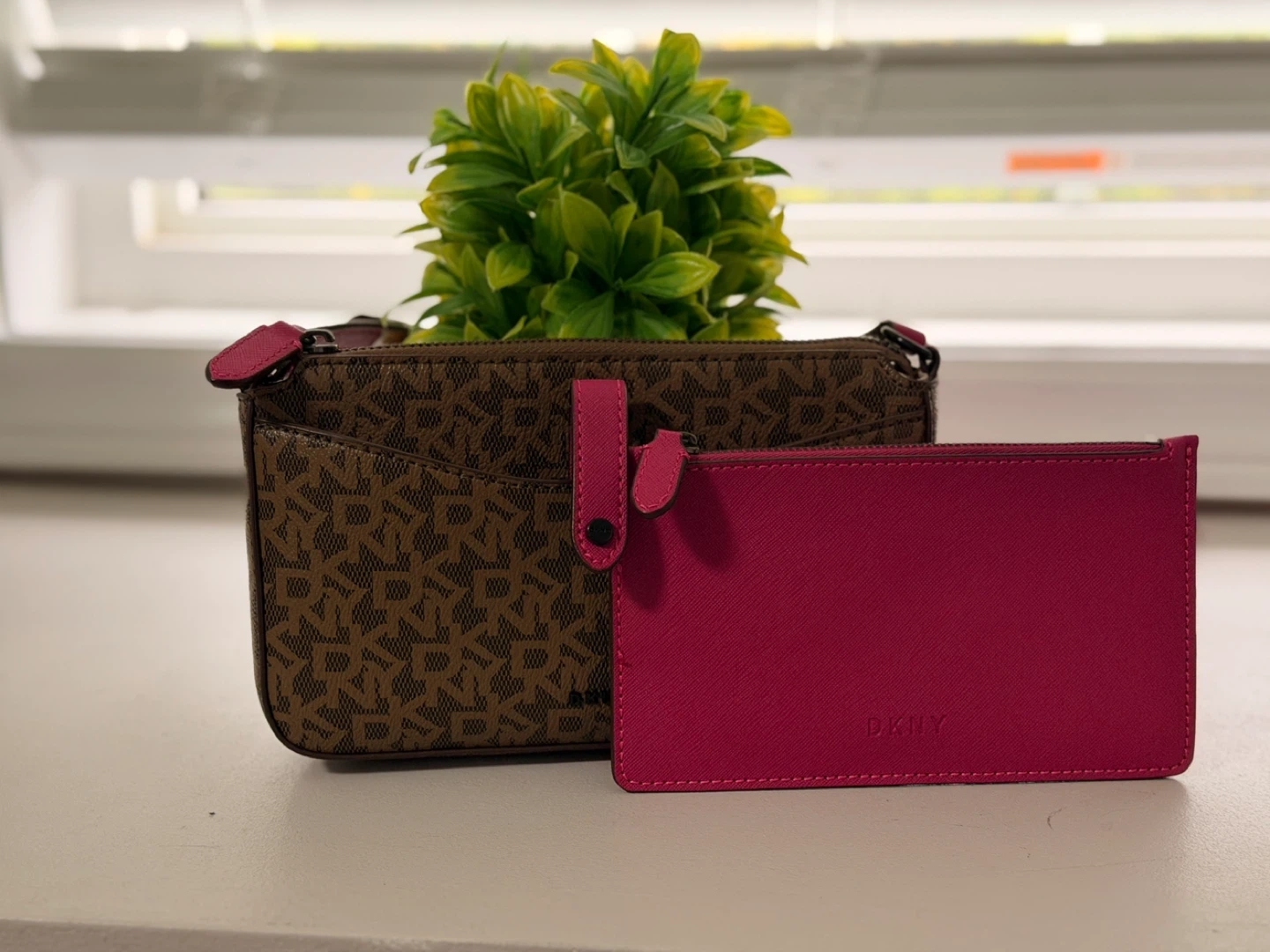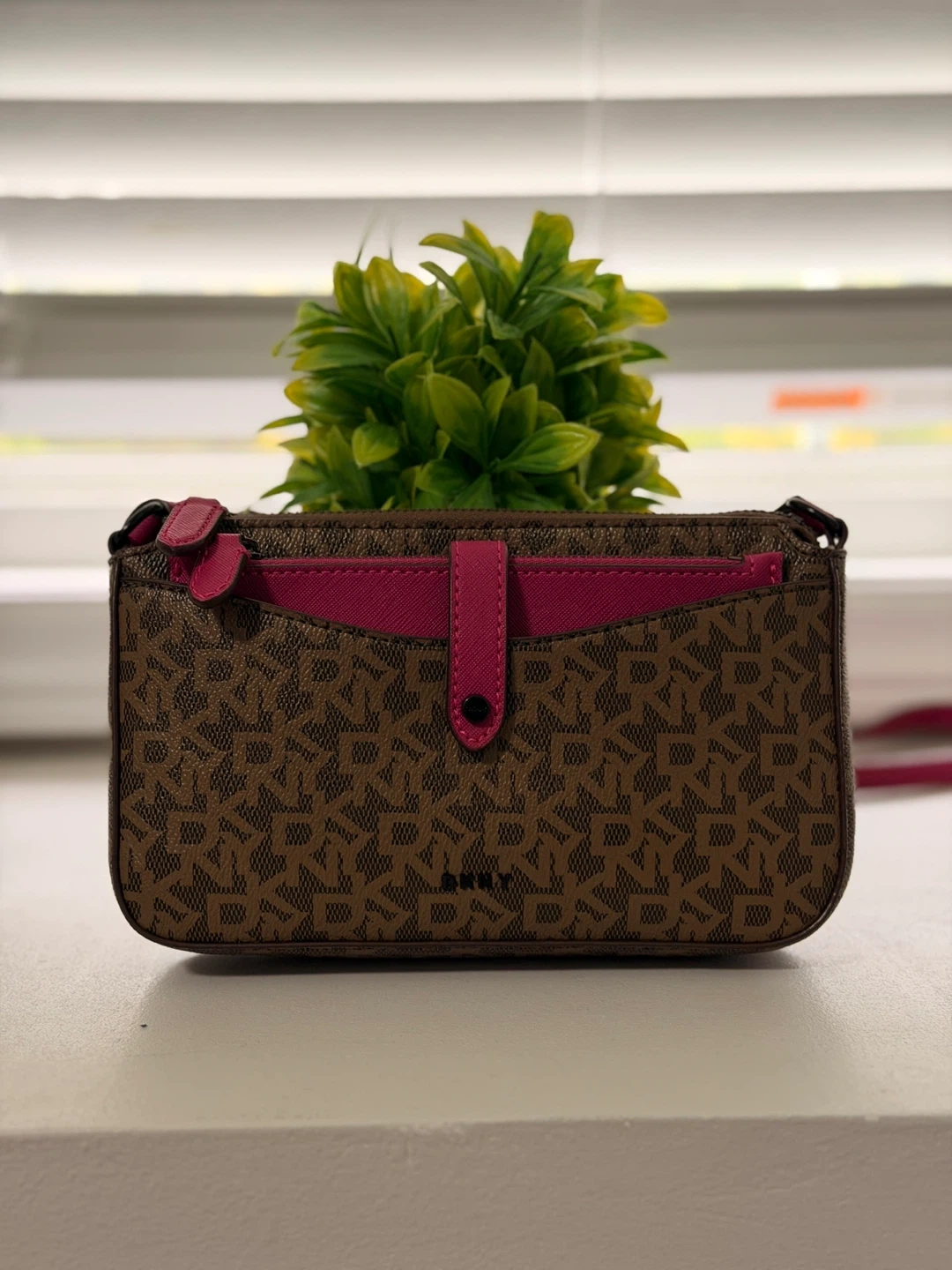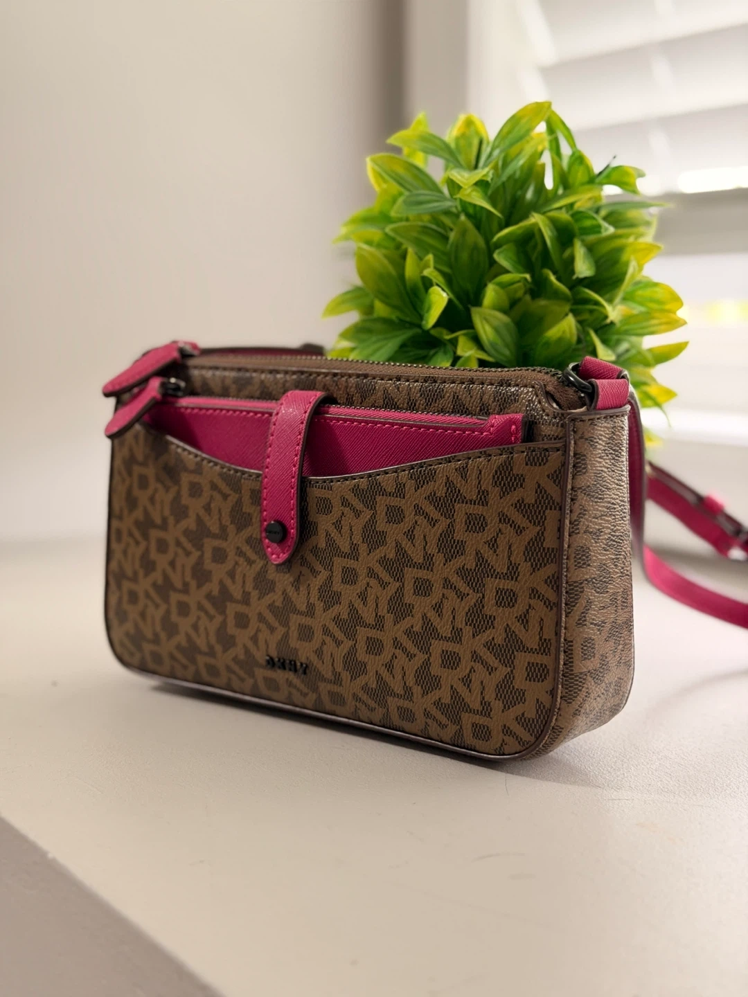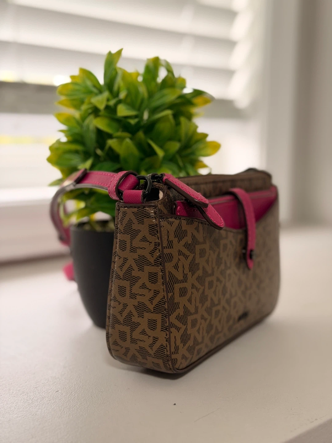 Here's a cute DKNY crossbody bag! It's in great shape and perfect for carrying your essentials. The bag features a stylish design with the DKNY logo pattern and a pop of pink. Compact and convenient for everyday use!