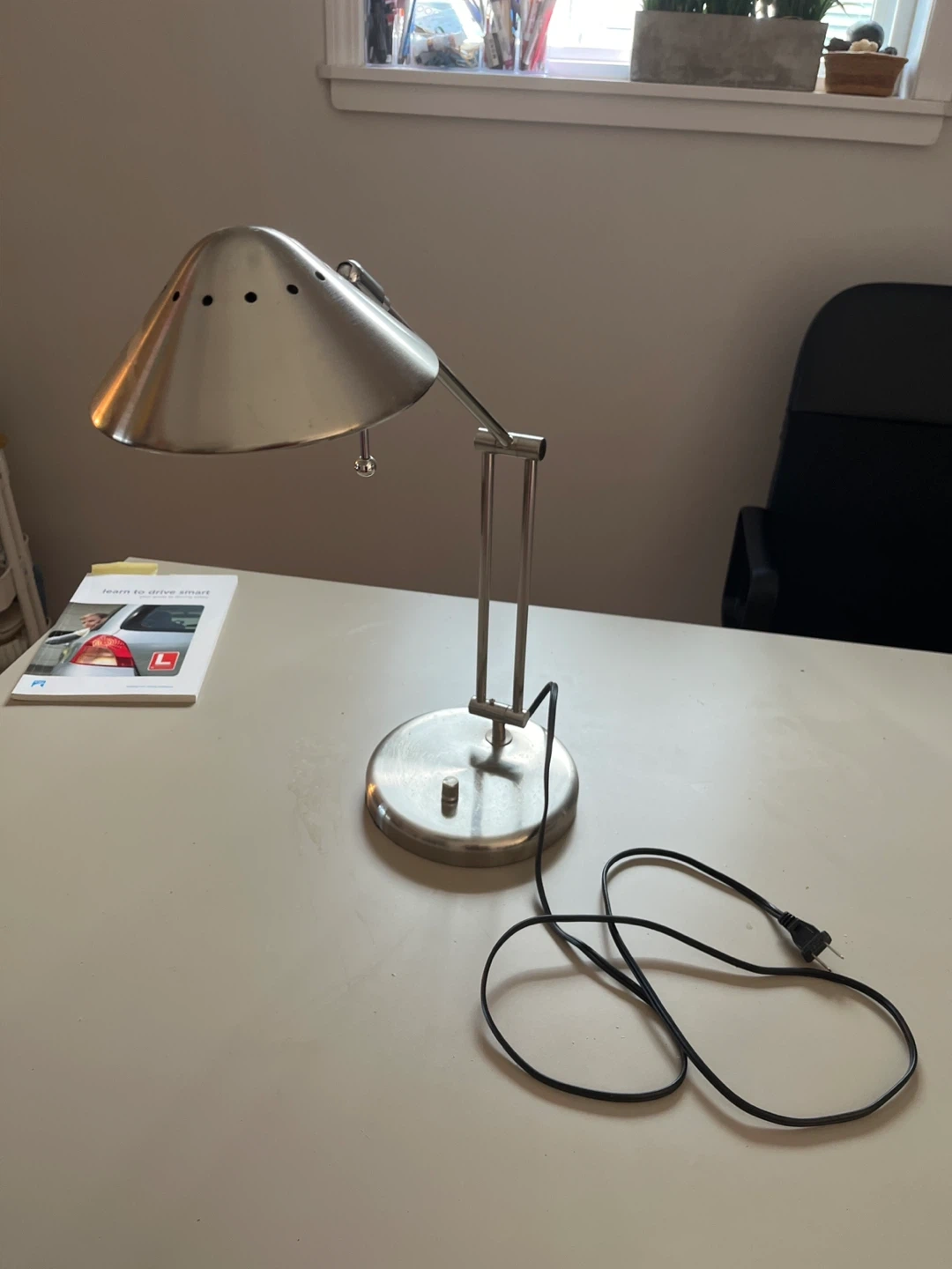 Selling a vintage metal lamp. It's in great shape and perfect for a home office or study space.