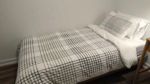 In excellent condition - perfect for child's bedroom. Organic Cotton, stripes of blue and green. Twin sized duvet cover, and single pillow sham. Will post photos of actual items shortly Pick-up near Bathurst/College Paid $250 for both items, and selling for $95