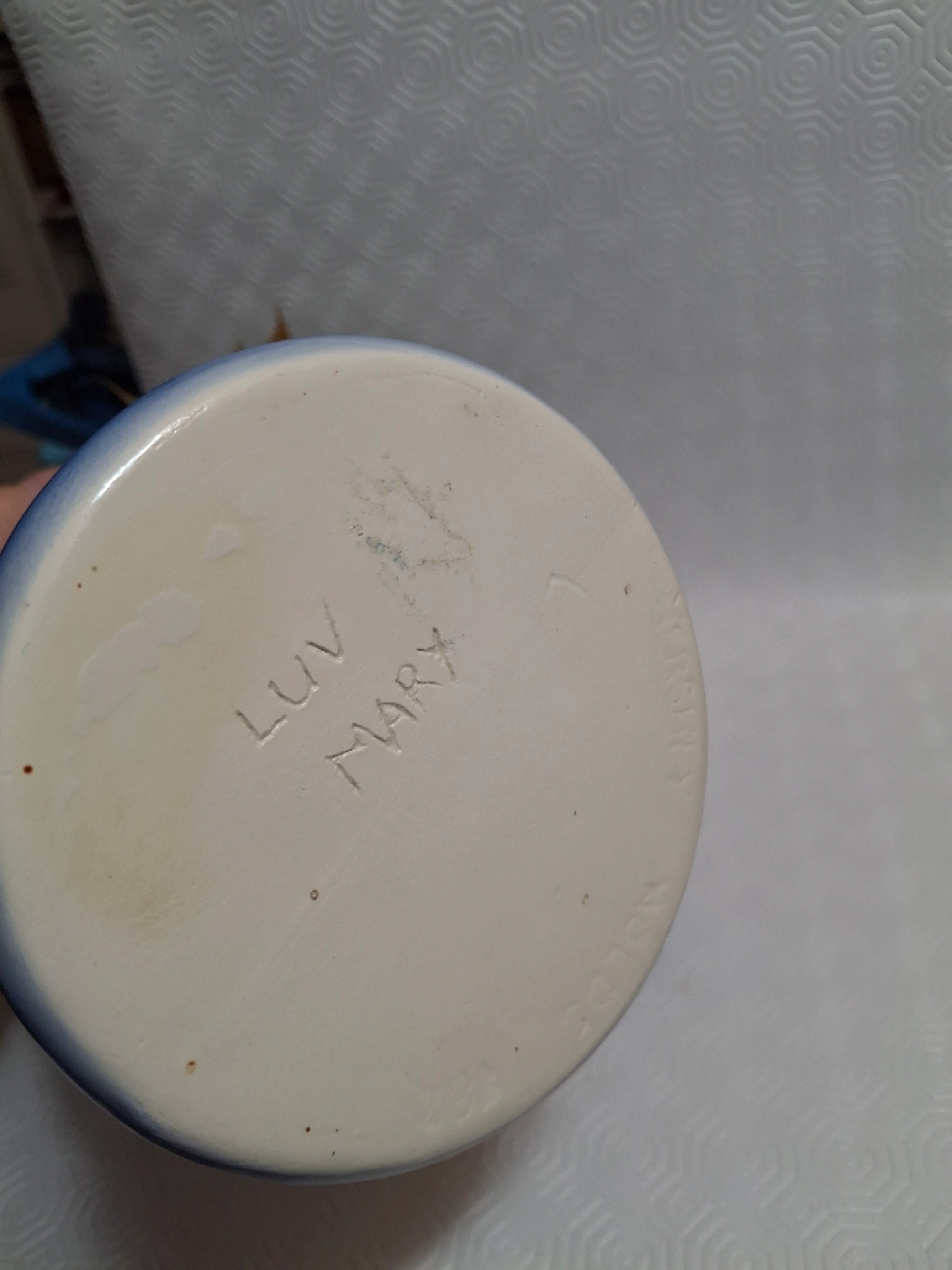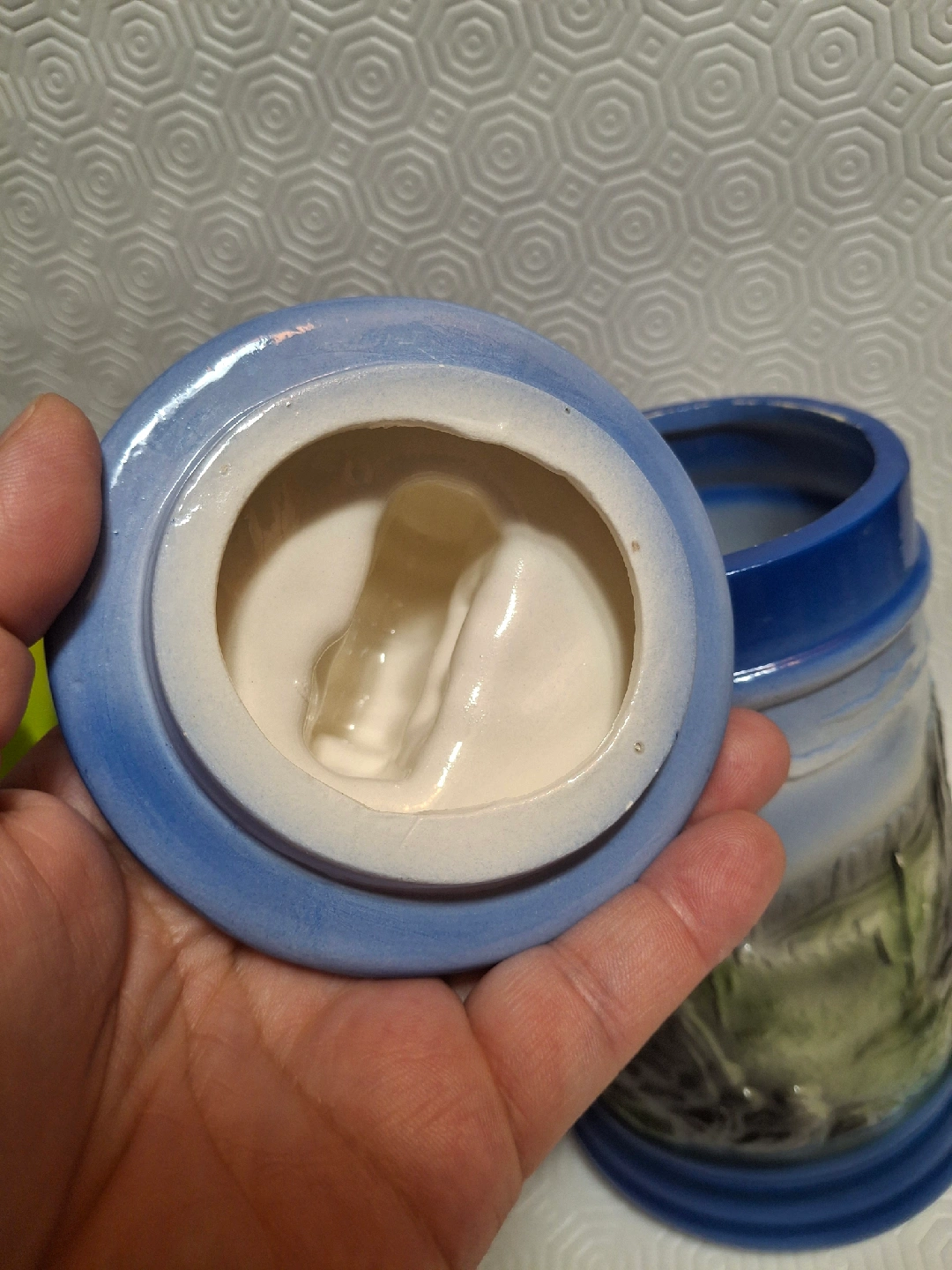 Selling a Luv Mary stein with a covered wagon on top! It's a really unique piece with a blue handle and base. The stein has a beautiful mountain scene on it. It's in great condition and would make a lovely addition to any collection