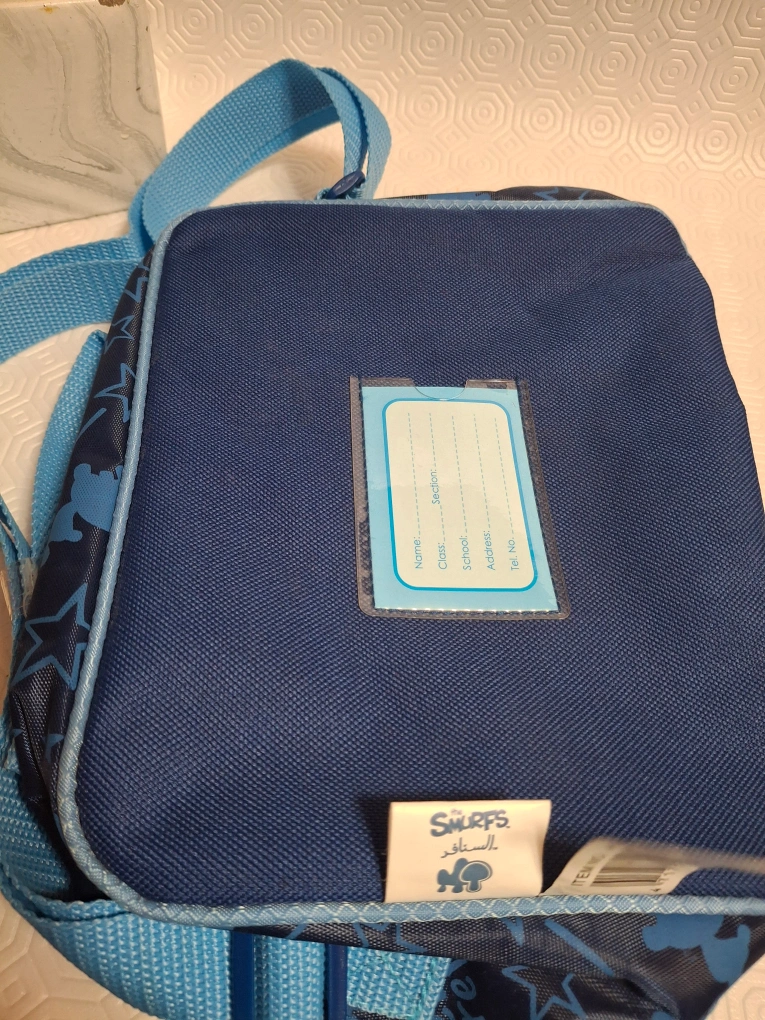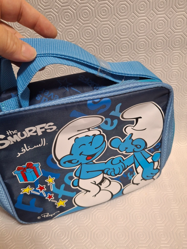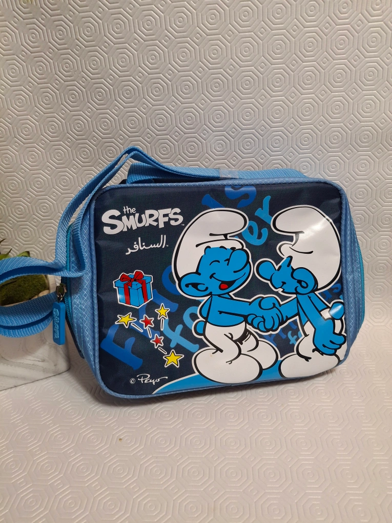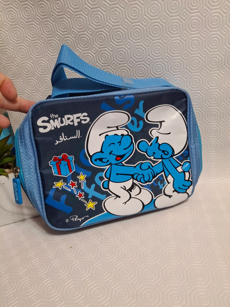 Here's a cute Smurfs lunch bag! It's blue and features a fun Smurfs design. Perfect for kids to take their lunch to school or on outings