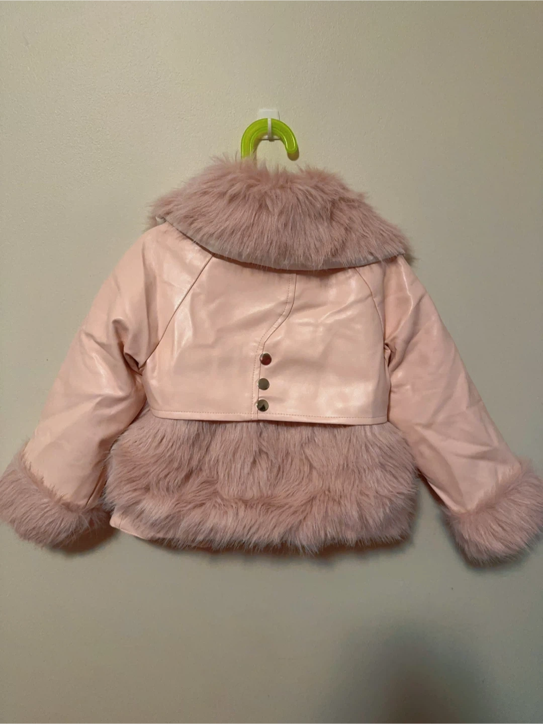 A cute pink jacket for girls! It features faux leather and faux fur trim. Perfect for keeping warm and stylish during the cooler months.