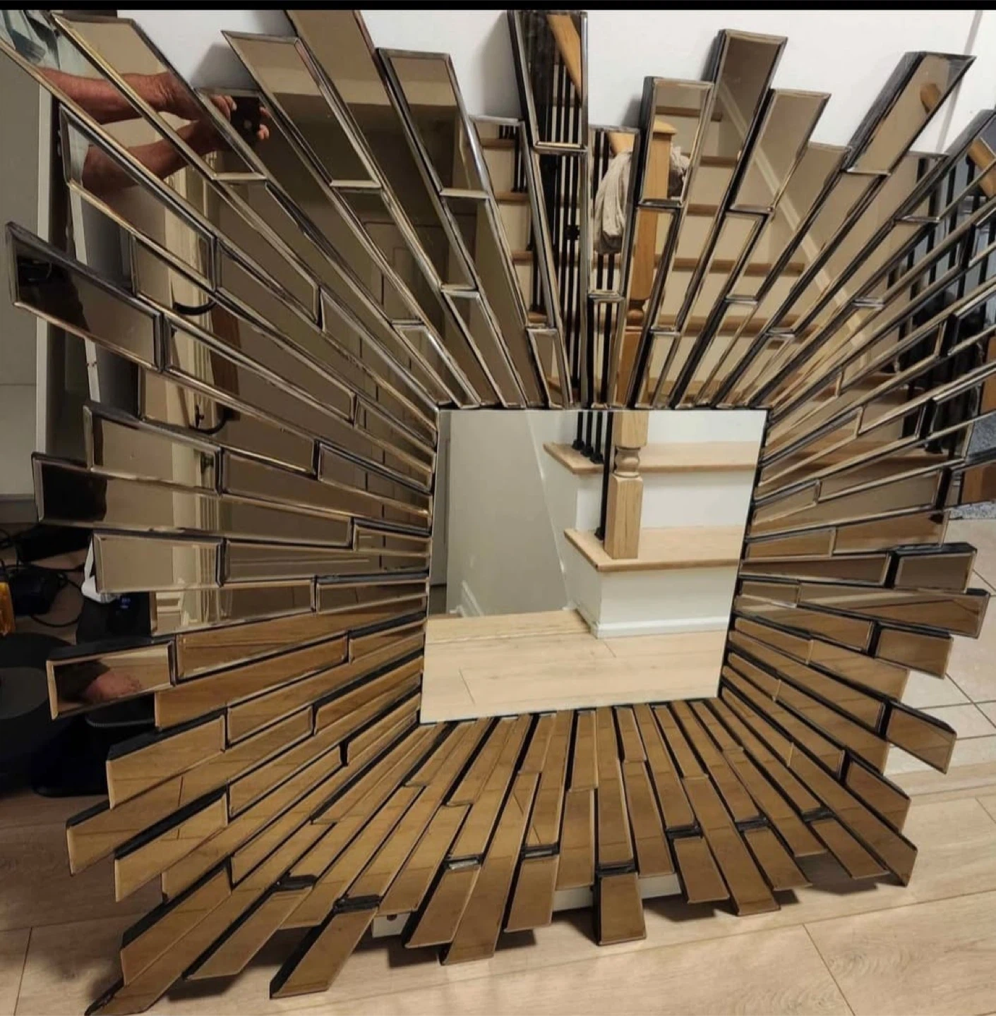 Unique starburst mirror in great condition! It's a real statement piece that would look great in any room. Adds a touch of glam to your home decor Modern Decorative Wall Mirror Add a touch of elegance and modern art to your space with this stunning square decorative wall mirror. Featuring a sunburst 3D geometric frame with beveled mirror panels, this piece is both functional and artistic
