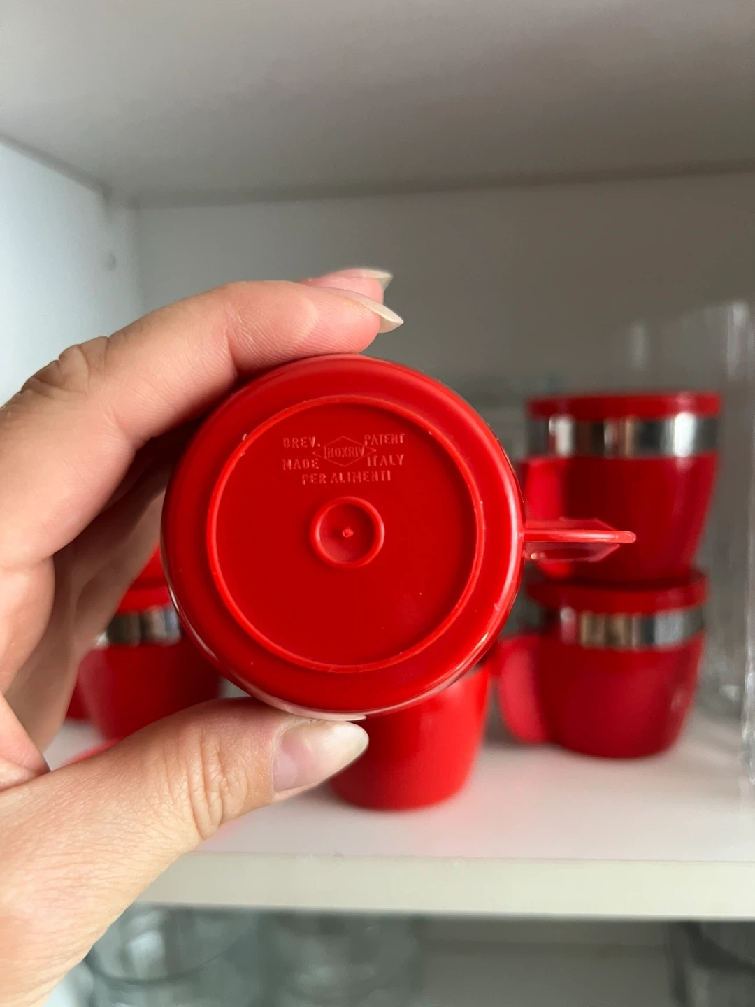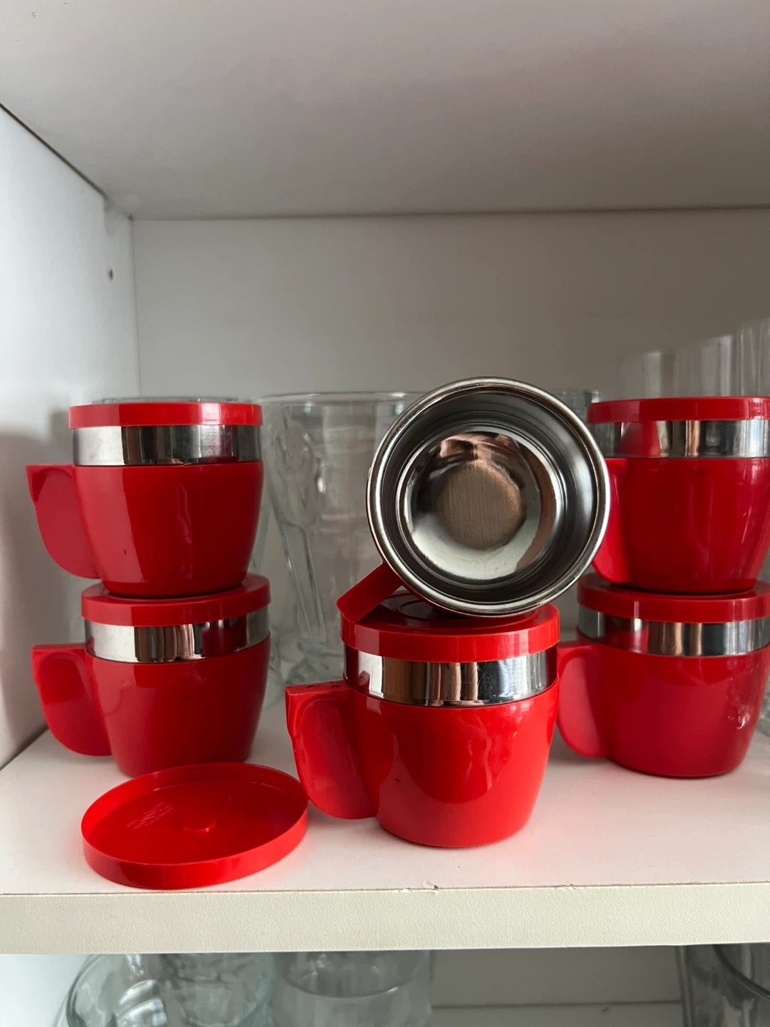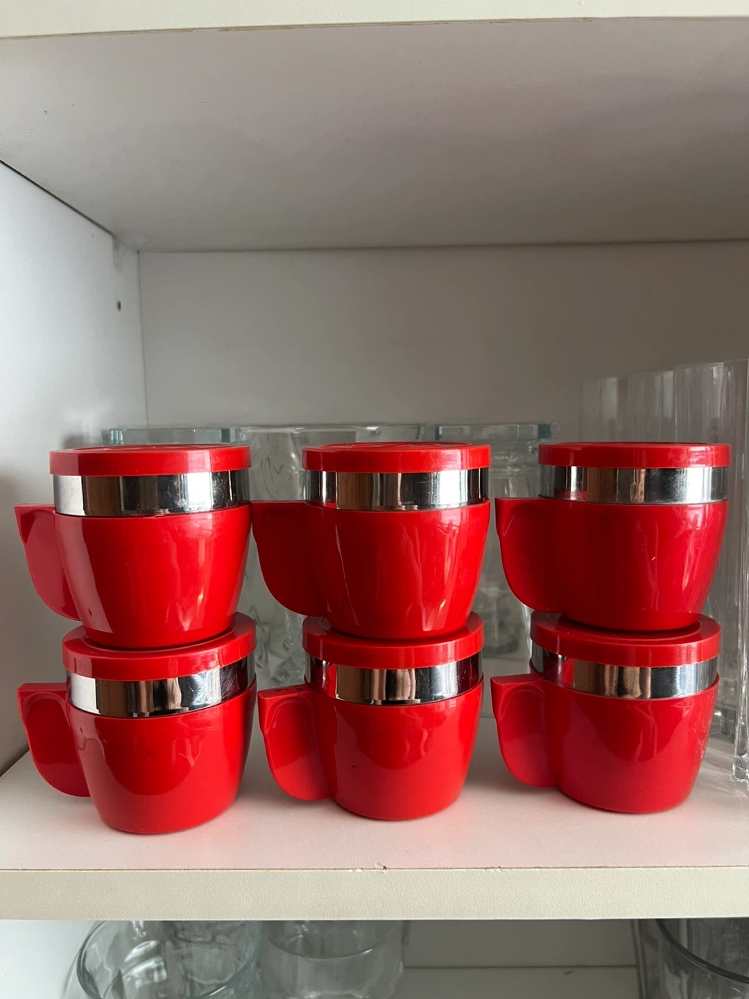 Set of six vintage espresso cups. They are a vibrant red with chrome accents. The bottom of the cups are marked Hoxriv Great for adding a pop of colour to your kitchen or for camping.