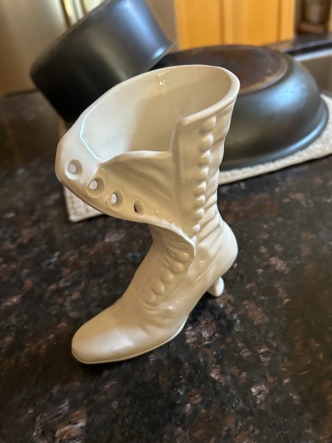 Selling a vintage ceramic boot vase. It's in great condition and would be a lovely addition to any room. The vase is shaped like a high-heeled boot with decorative button details. It’s perfect for displaying flowers or as a standalone decorative piece