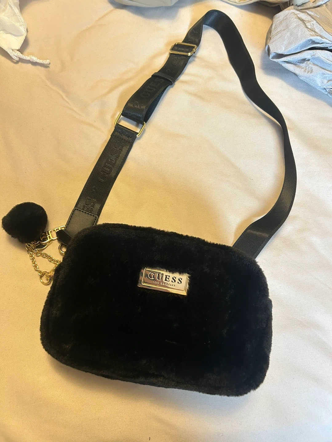 Selling a cute Guess crossbody bag! It's made of soft, black faux fur and has a stylish strap with the Guess logo on it. Perfect for adding a touch of fun to any outfit. Just used twice, very good condition!!
