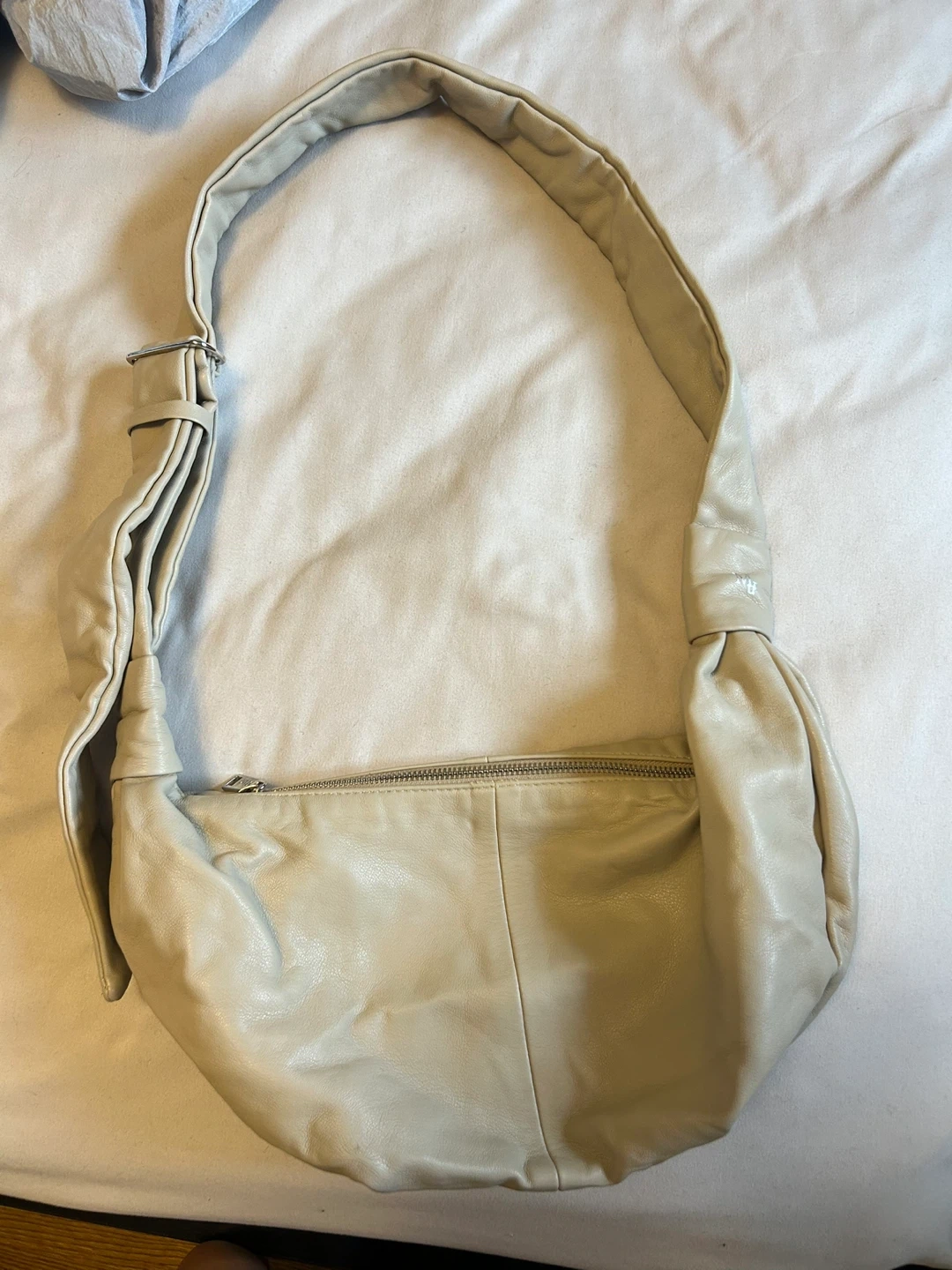 Selling a stylish beige leather shoulder bag. It's in great condition and perfect for everyday use. The bag features a zipper closure and a comfortable shoulder strap. It's a versatile accessory that will complement any outfit!