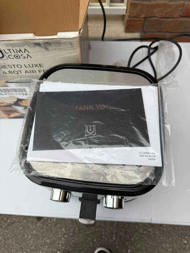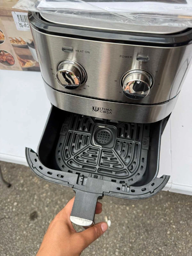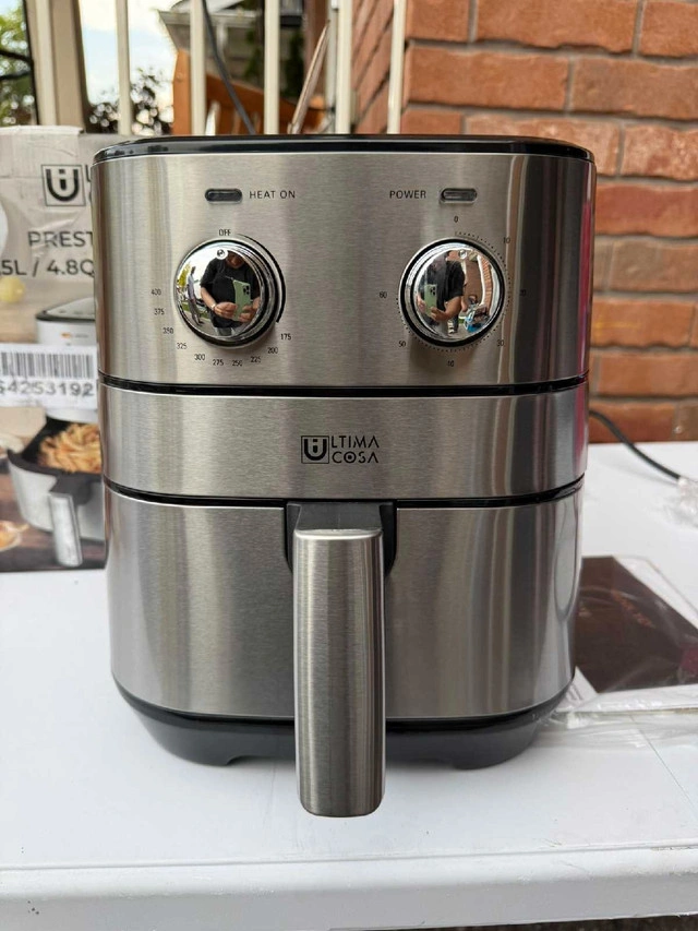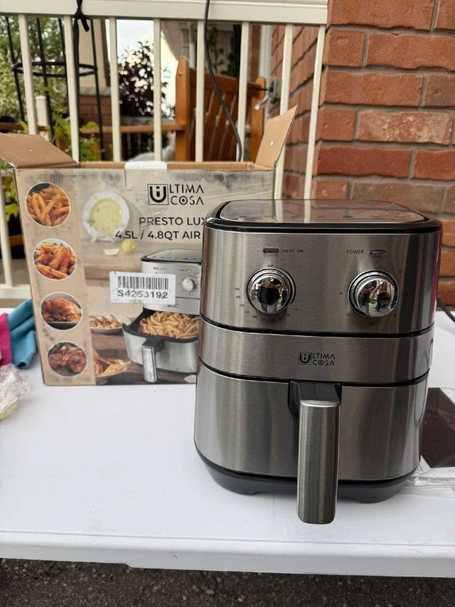 Ultima Cosa Presto Luxe 4.5L / 4.8Qt Air Fryer (AF004V4S) – Brand New Open Box. Enjoy healthier, crispy meals without the guilt! This high-performance Ultima Cosa air fryer uses advanced heat technology to give you the taste and crunch of deep frying with far less oil. Opened only to check contents – unused and in excellent condition. Cooks up to 4.2 lbs of food – perfect for family meals. Crispy results with 88% less fat vs. traditional frying. Digital touch screen – simple, intuitive controls. 3D Heat Flow Technology – cooks evenly every time. 8 preset cooking modes – one-touch convenience. Auto shutoff function for safety. Dishwasher-friendly non-stick pan & basket. Anti-slip feet for stability. Pickup in Milton | Mississauga can be arranged.
