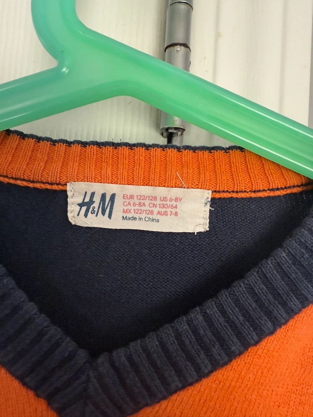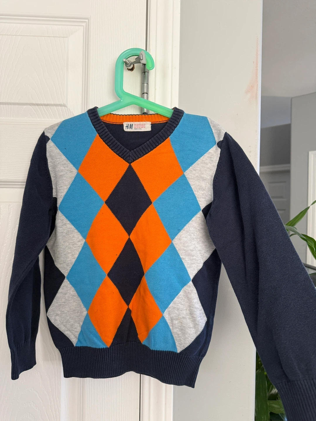This H&M sweater features a classic argyle pattern in shades of blue, orange, and gray. It's a size 6-8 years (US) or 122/128 (EUR). Perfect for keeping your little one warm and stylish!