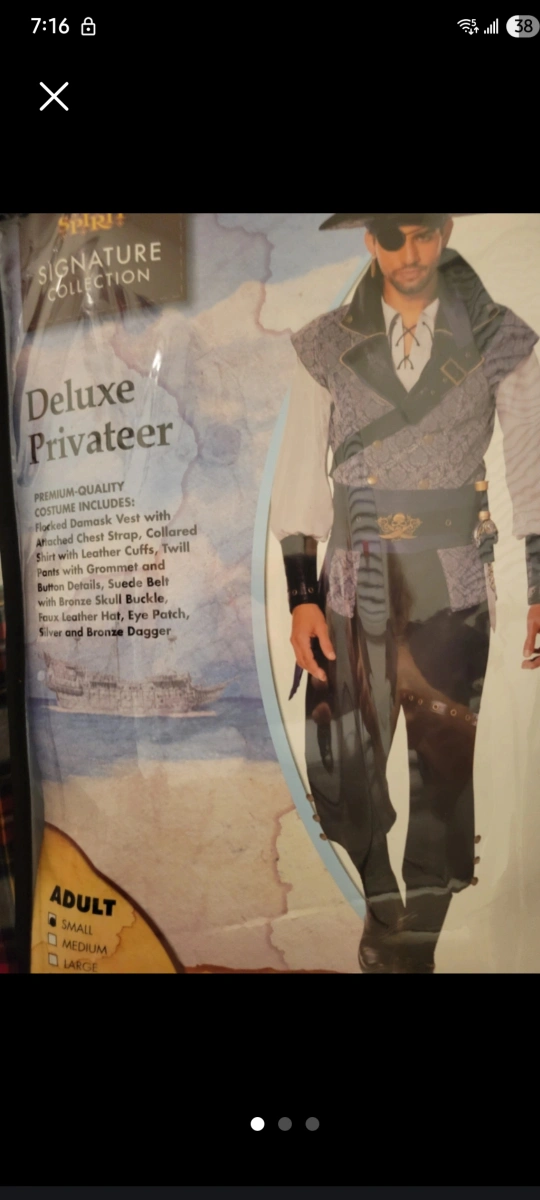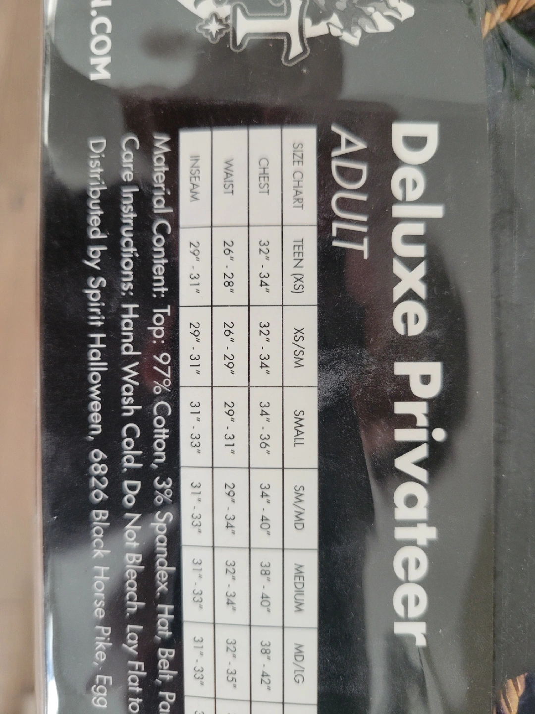 Get ready for Halloween with this deluxe privateer costume from Spirit Halloween! It's a size small and includes a decked dagger vest with an attached chest strap, collared shirt with leather cuffs, twill pants with grommet and button details, a suede belt with a metal buckle, and a silver and bronze dagger. Originally bought for $89.99! Please note the eye patch is not included nor the hat. That's why the 69.99 discount.