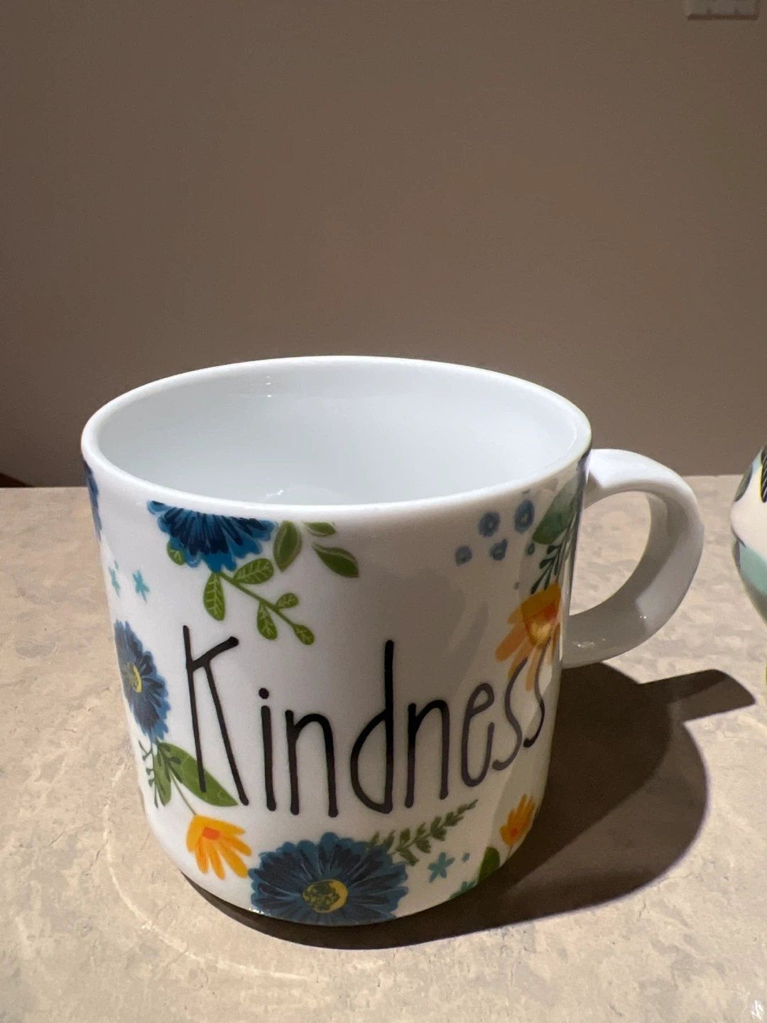 Selling some cute mugs! - One mug features the word 'Kindness' with floral designs - The other two have unique leaf patterns with yellow and green accents
