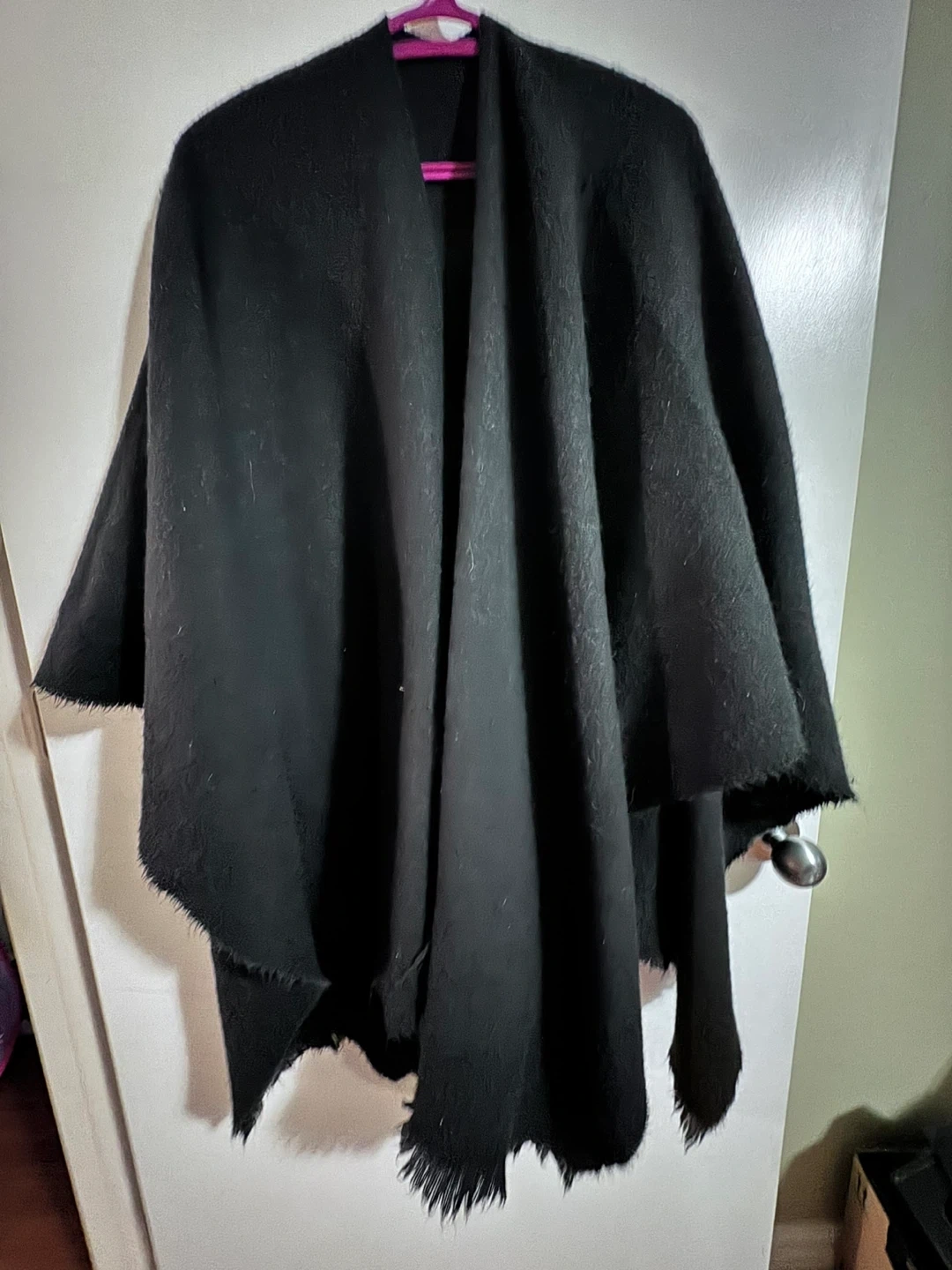 Selling a cozy black shawl wrap. It's in great condition and perfect for adding a touch of warmth and style to any outfit!