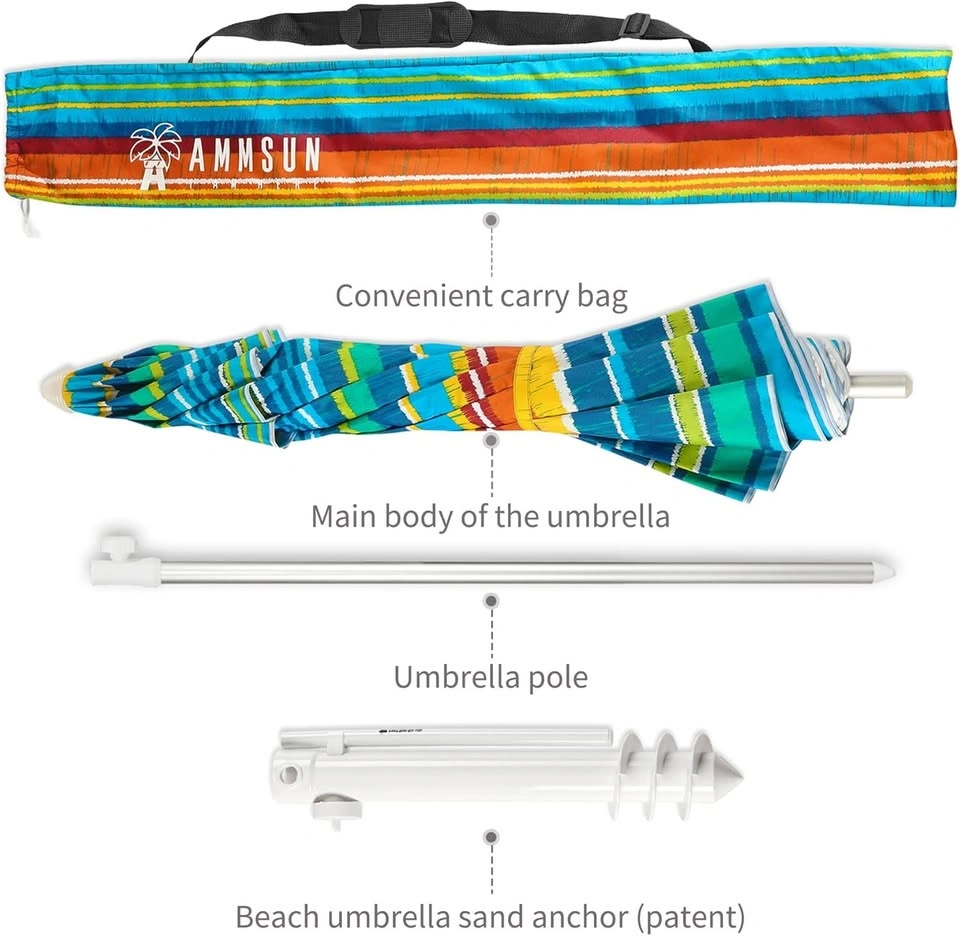 AMMSUN Beach Umbrella with removable sand anchor. It has UPF50+ protection, blocking over 98% UVA and UVB rays. The tilt feature lets you adjust the angle. Premium metal pole with height adjustment. 8 fiberglass ribs for durability. Includes carry bag. Great for the beach, patio, and more! Pick up in Pickering by Whites Road and Sheppard Ave.