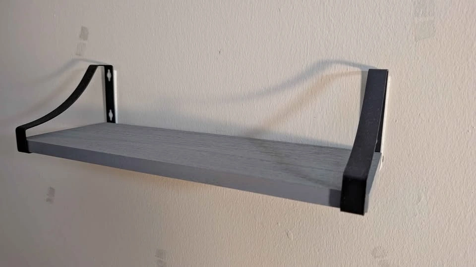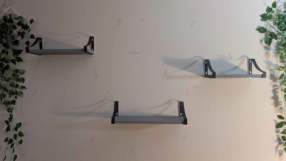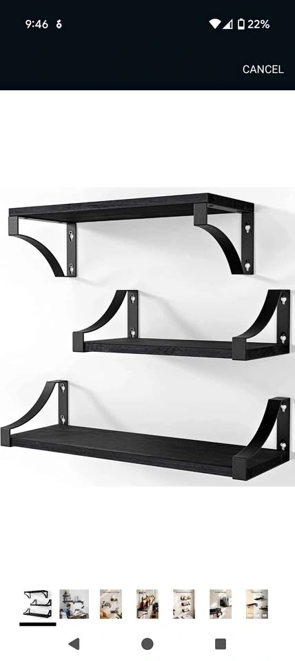 Floating wall shelves. Dark grey painted wood. Set of 3 shelves (each 4.7" wide) with different lengths as follows: Large - 16.5" L Medium - 14" L Small - 11.4" L We have used 3M tapes to fix them to the wall and it does hold pretty well with about 20lbs of weight. We have the original screws (concrete, drywall and wood) to fix them to the wall. It can take 40lbs of weight if fixed to the wall. Moving sale (check out my other listings as well).