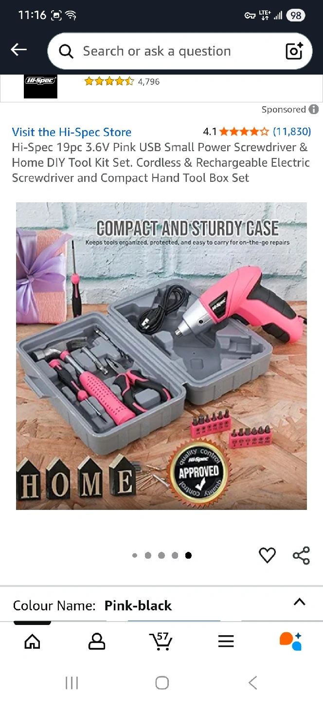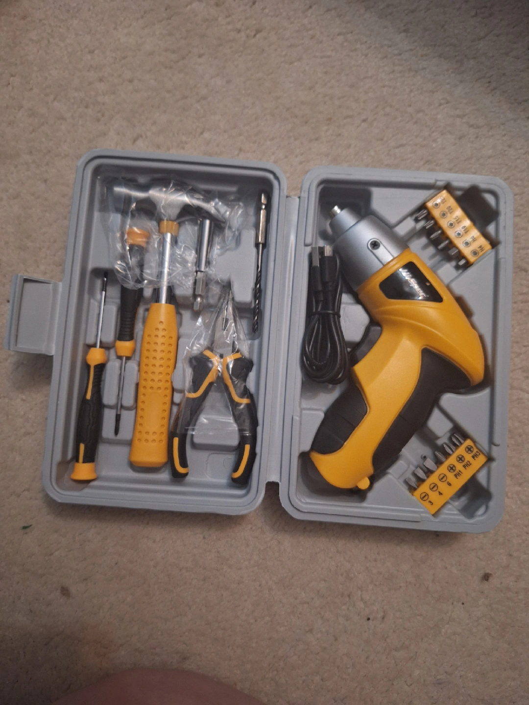 Hi-Spec 19pc 3.6V USB Small Power Screwdriver & Home DIY Tool Kit Set. Cordless & Rechargeable Electric Screwdriver and Compact Hand Tool Box Set. It comes with a USB for charging.
