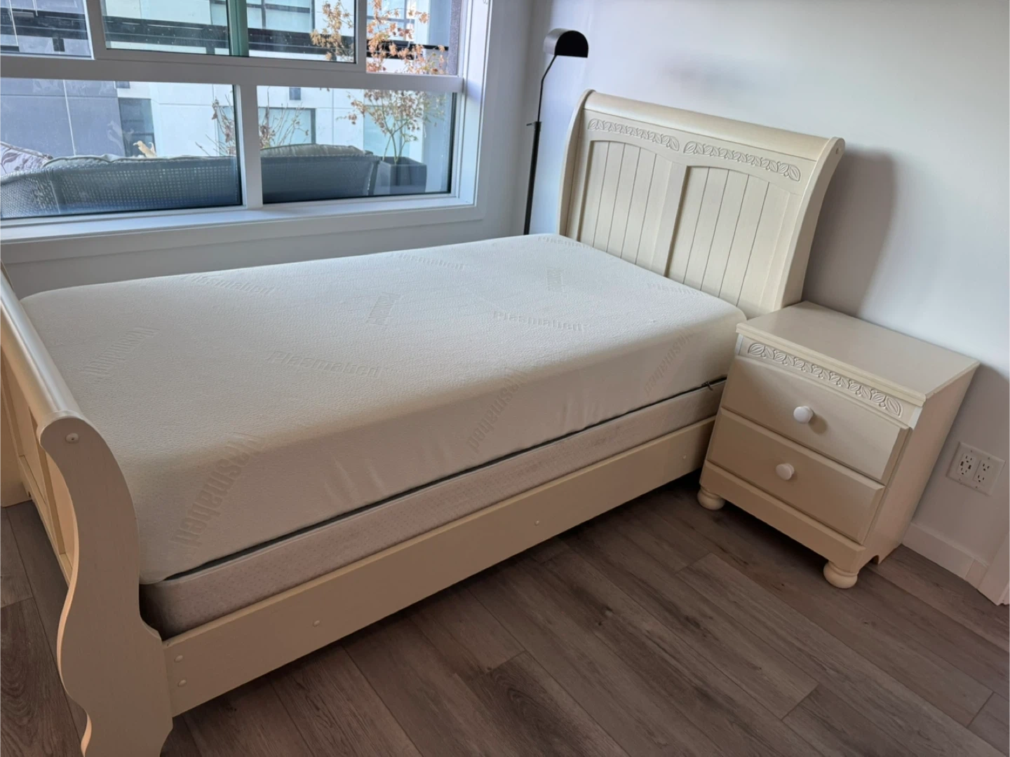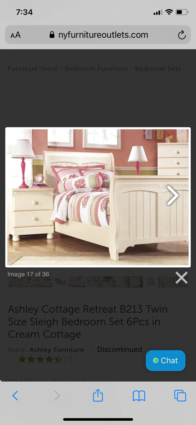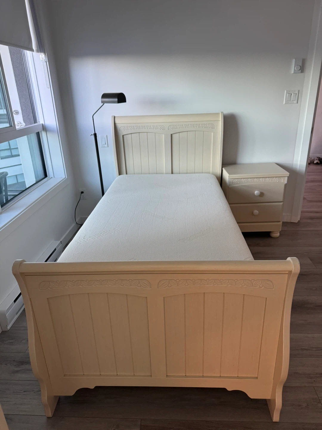 Selling a complete Ashley Cottage Retreat B213 Twin Size Sleigh Bedroom Set in Cream Cottage colour! This set includes a bed, nightstand, and dresser. It's in great condition and ready to bring a touch of cottage charm to your home. Twin Sleigh Headboard : 40.79" W x 6.61" D x 45.24" H Twin Sleigh Footboard : 40.79" W x 6.22" D x 31.02" H Twin Sleigh Rails: 40.28" W x 75.75" D x 7.17" H Two Drawer Night Stand: 20.87" W x 15.63" D x 25.28" H Dresser : 55.75" W x 15.63" D x 33.19" H
