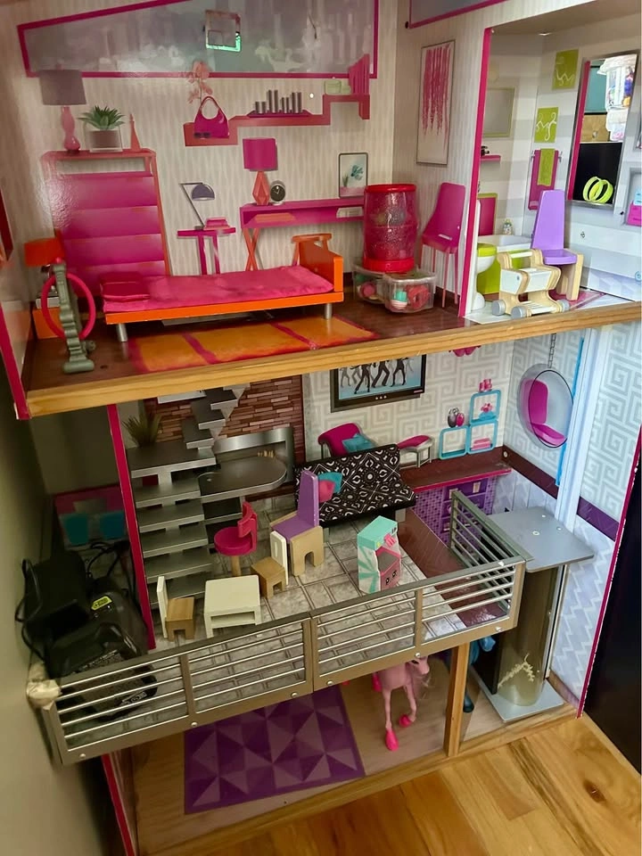 Good condition KidKraft Modern Luxury Dollhouse, designed to accommodate 18-inch dolls. No accessories included. Please note, item is quite large and heavy and will need an SUV or truck to pickup. Approximate Assembled Dimensions in inches: 12 W x 32 L x 47 H