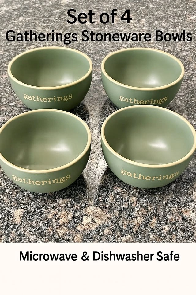 These earthy, sage-green stoneware bowls are perfect for serving snacks, soups, dips, or your fave midnight cereal. Each bowl is embossed with the word “gatherings” — setting the tone for connection, comfort, and good eats. ✨ Features: Set of 4 matching bowls Durable stoneware construction Microwave & dishwasher safe Smooth matte glaze with a warm, natural vibe No chips 🫶 Perfect for small get-togethers, family dinners, or making your shelfie look extra aesthetic. ============================= 🛍️✨ BUY 2+ ITEMS, GET 50% OFF ============================ 🛍️✨ Check out my other listings too! Tons of great deals, unique finds, and useful stuff looking for a new home! Snag something before it’s gone! 💥💸