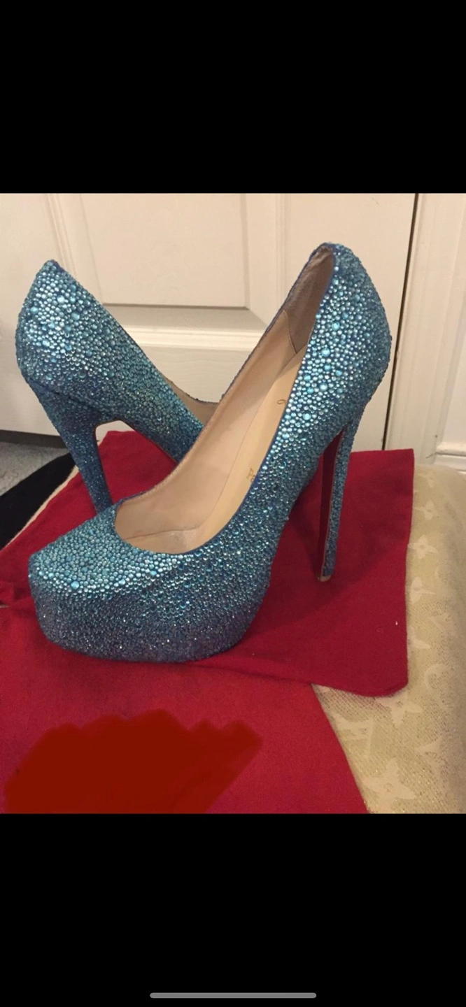 Gorgeous pair of Christian Louboutin heels in a stunning blue glitter finish! These platform heels are sure to turn heads with their signature red soles. They're in great condition and ready for a night out