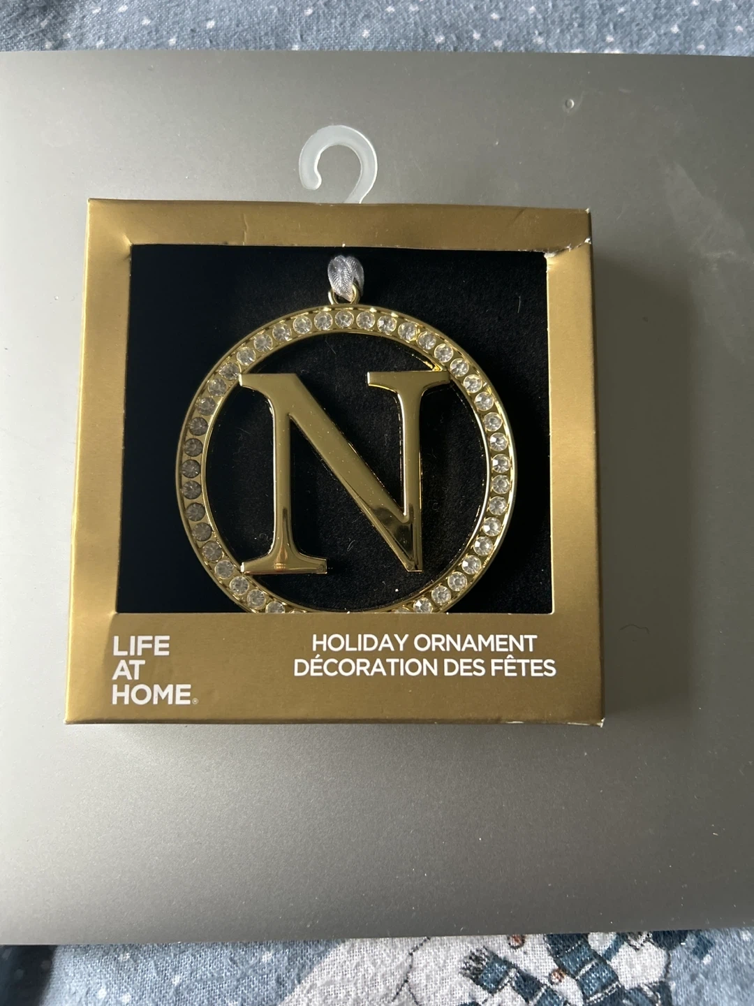 Selling a brand new Life At Home holiday ornament featuring the letter N! It's a beautiful gold colour with sparkly accents, perfect for adding a personal touch to your holiday decorations
