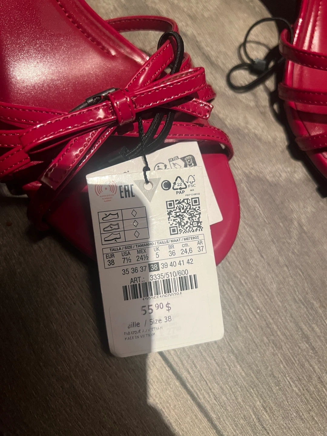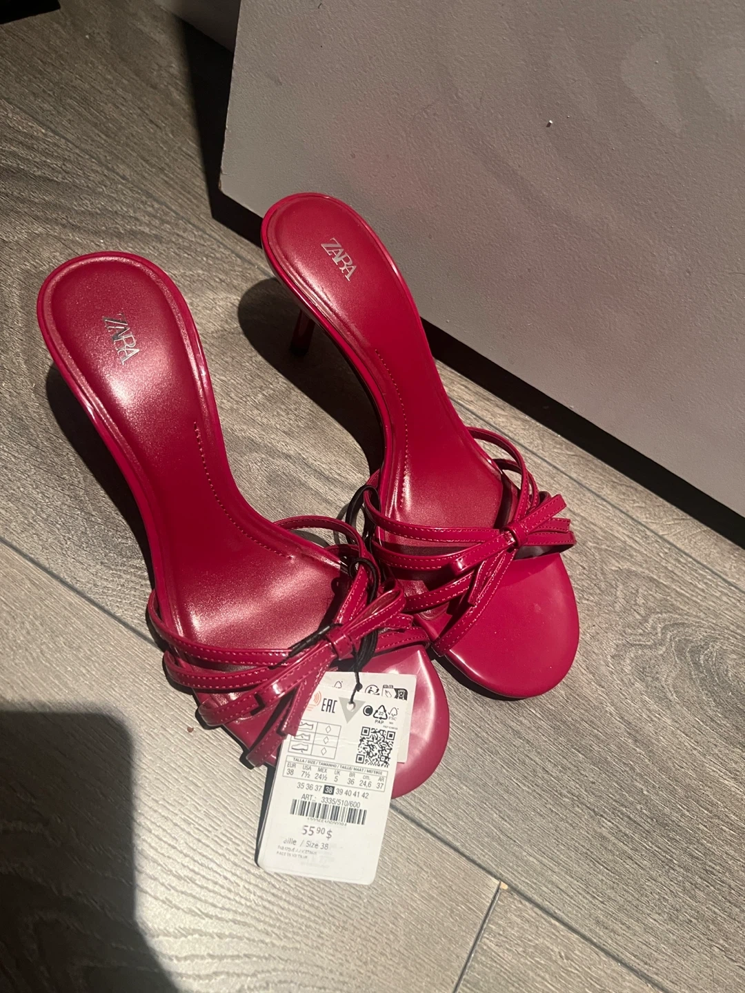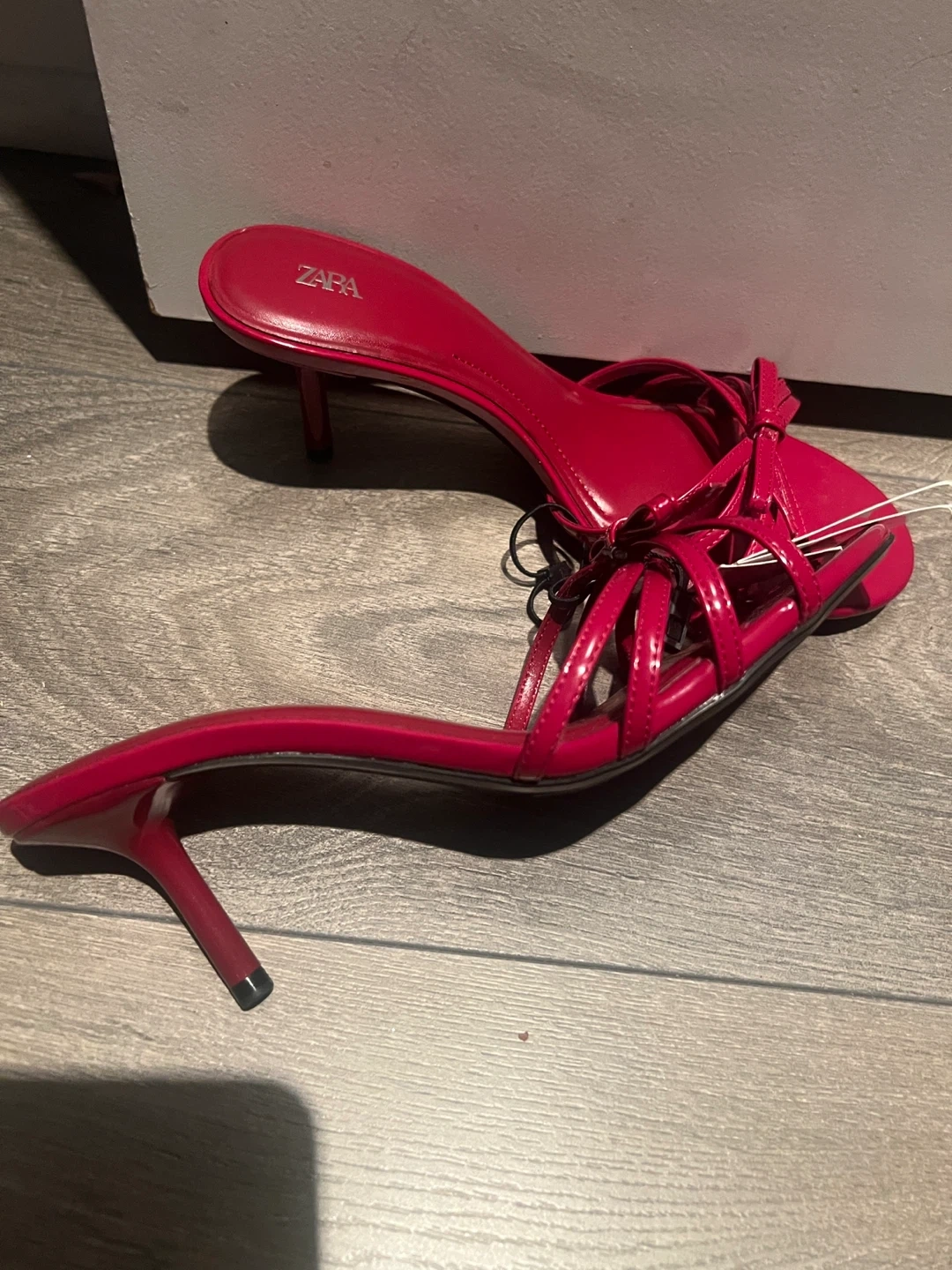 These Zara heeled sandals are brand new with tags! They are a vibrant red colour and a size 7.5 (US). The tag indicates they were originally $55.90.