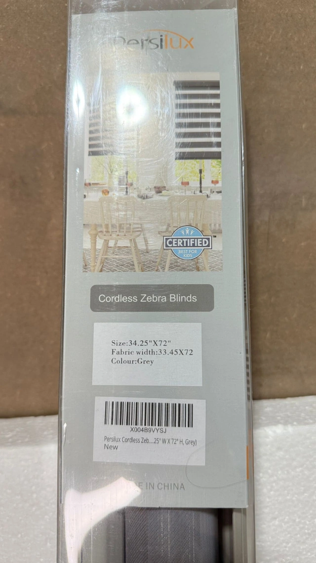 Grey Zebra Shades No Drill Blinds 34" W x 72" H – Cordless Sheer Light Filtering Window Coverings. Final sale – no returns, no warranty. Check and test on pickup. Pickup: St. Catharines – North. Condition: New. Cordless, no-drill installation – renter & condo friendly. Size: 34" wide x 72" high. Dual zebra design – adjust light and privacy levels easily. Adjustable tension mount – fits securely without hardware. Light filtering sheer fabric in stylish grey. Child-safe & pet-safe cordless operation. Perfect for bedrooms, living rooms, kitchens & offices. Cross-posted on other platforms. Cash or e-transfer accepted. Tested and works perfectly. Available until sold.