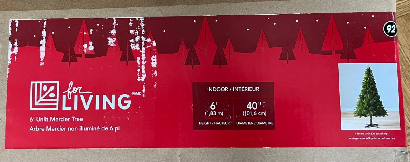 Selling a 6' Unlit Mercier Tree from For Living. It's 6 feet tall and 40 inches in diameter. Also included are various Christmas ornaments and lights to decorate the tree with!