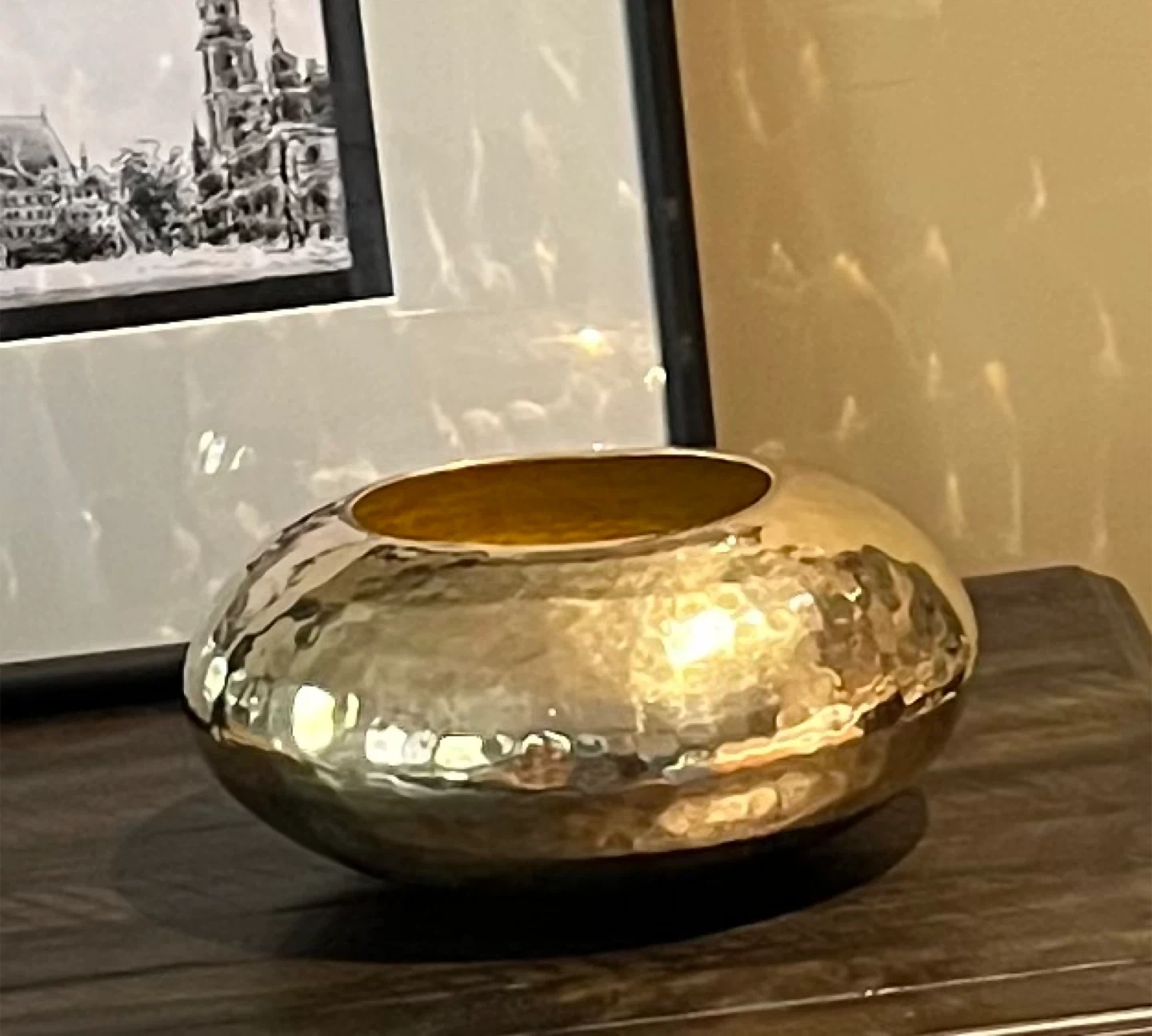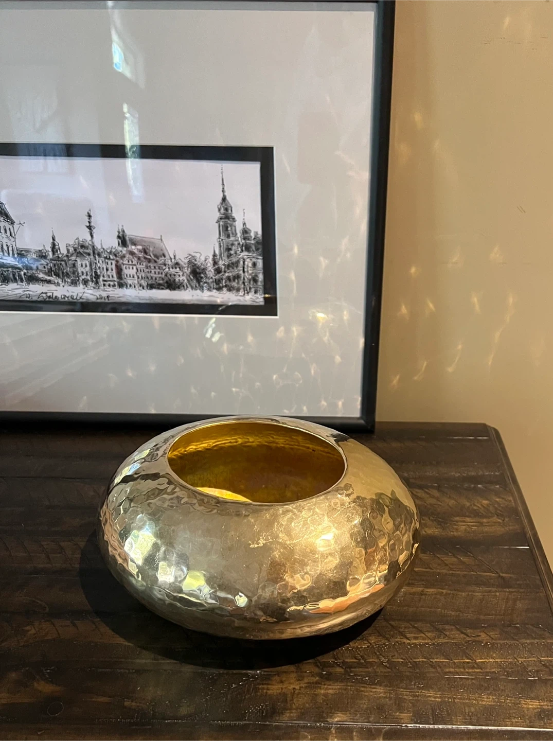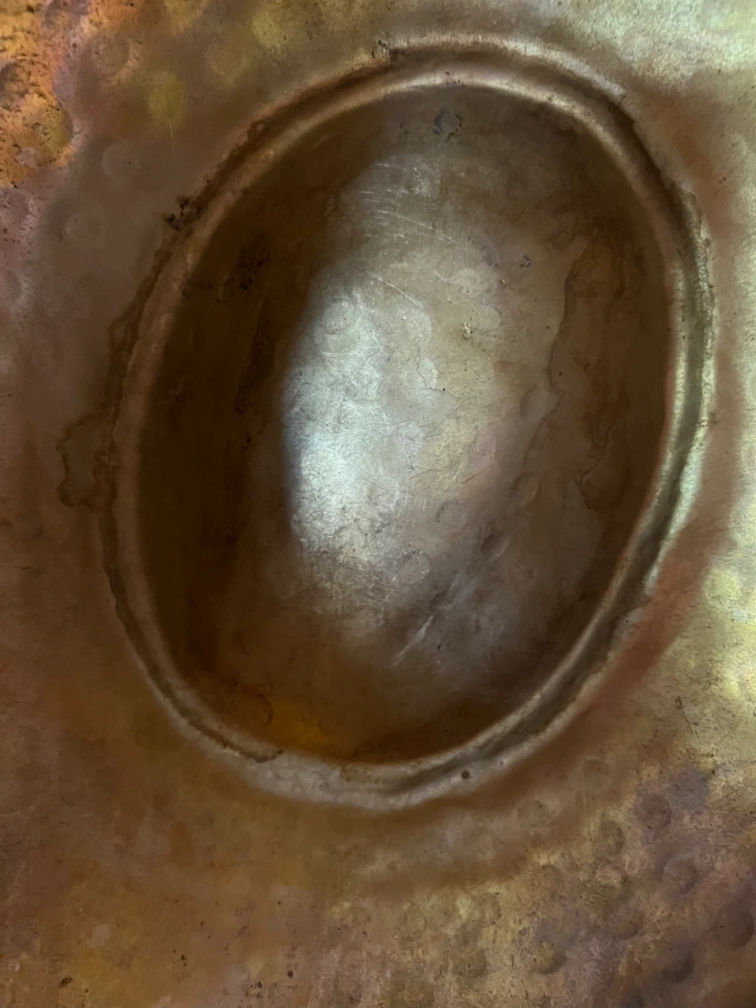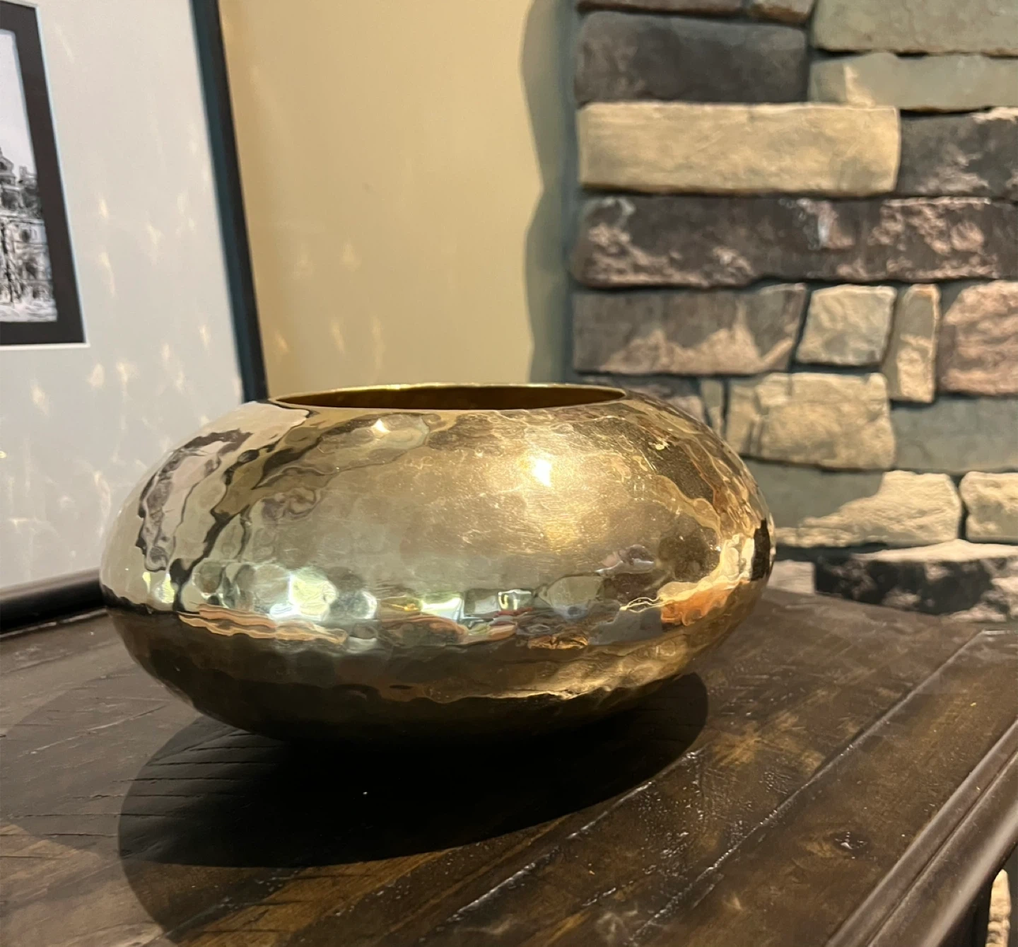 Stunning vintage vase/bowl/planter Hammered texture on the outside Oblong shape Made in India Good vintage condition, polished recently Bright and shiny! 5” tall 5.5” across opening Faux greenery arrangement is not included Asking $20 Interested? Message me and please check my other listings…